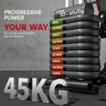 • ✔ Įvairi įranga: suoliukas su svoriais, krūtinės spaudimas, lenkimas, lenkimo juosta, kojų lenkimas, 410 kg pasipriešinimo svorio juostos ir