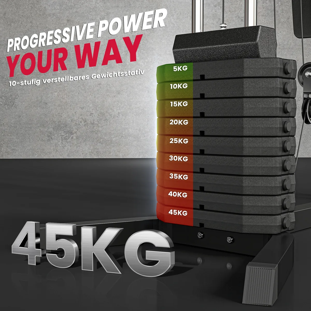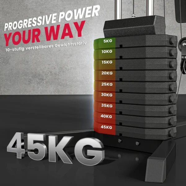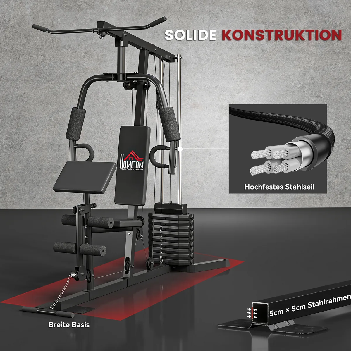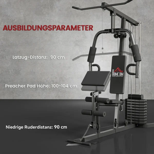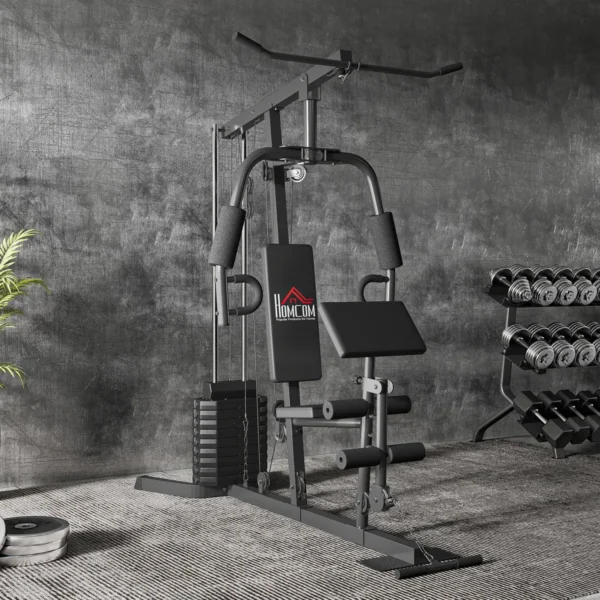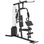 Efektyviai treniruokite rankas, kojas, nugarą ir krūtinę su šia universalia HOMCOM sporto sale. Treniruočių stotyse yra: aukšto ir žemo ilgio ištraukimai, spaudimo ant suoliuko įtaisas, reguliuojamas pagalvėlė bicepso garbanoms, drugelio presas, kojų lenkimo įtaisas. Svorio blokas gali būti lengvai reguliuojamas naudojant kaištį, leidžiantį reguliuoti iki 45 kg. Treniruokitės namuose taip subalansuotai ir efektyviai kaip treniruoklių salėje!