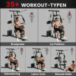 - ✔ Viskas viename įrenginyje: žemo/aukšto lato nusileidimas, drugelis, spaudimas ant suoliuko, kojų garbanos, paminkštinimas bicepso garbanoms
