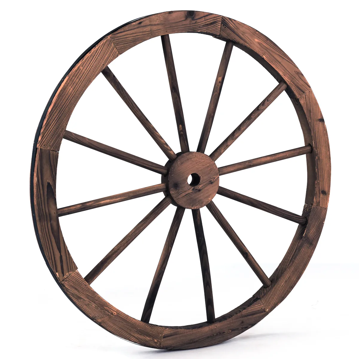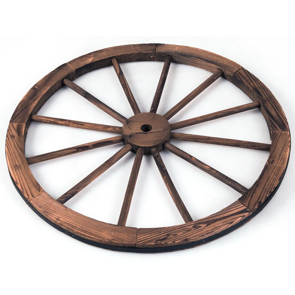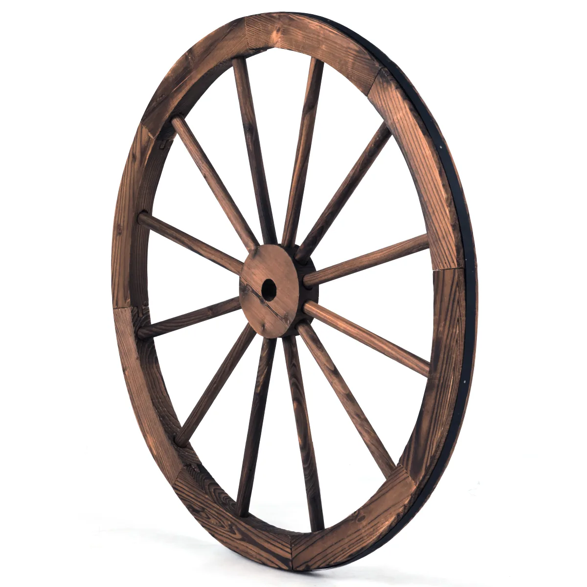 Dekoratyvinis vežimo ratas sodui, pagamintas iš eglės medienos, puikiai tinka įvairiems interjero ir eksterjero sprendimams. Rudas medinis ratas su metaline armatūra išsiskiria ilgaamžiškumu ir tvirtumu, todėl gali būti naudojamas kaip originali dekoracija.
