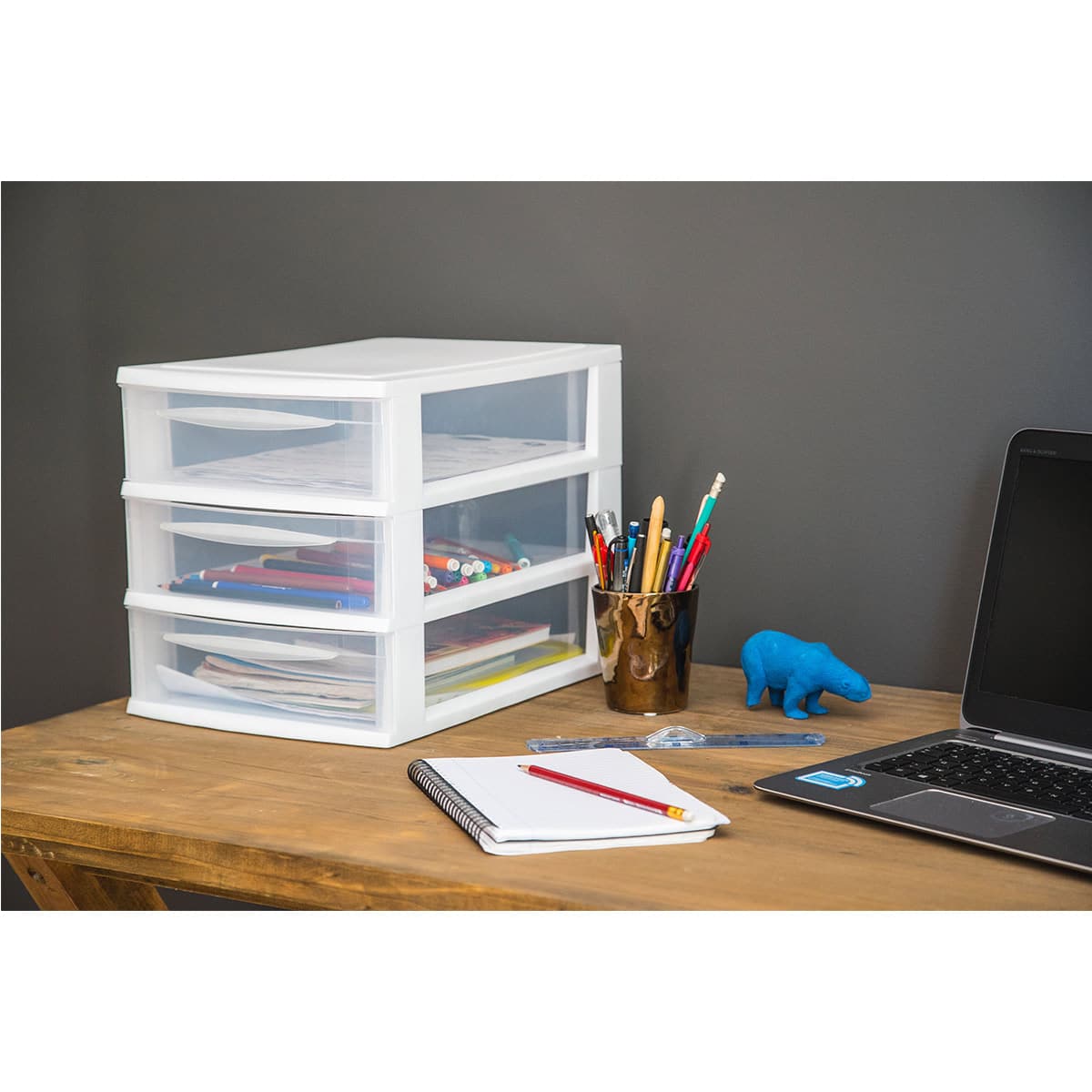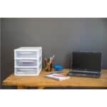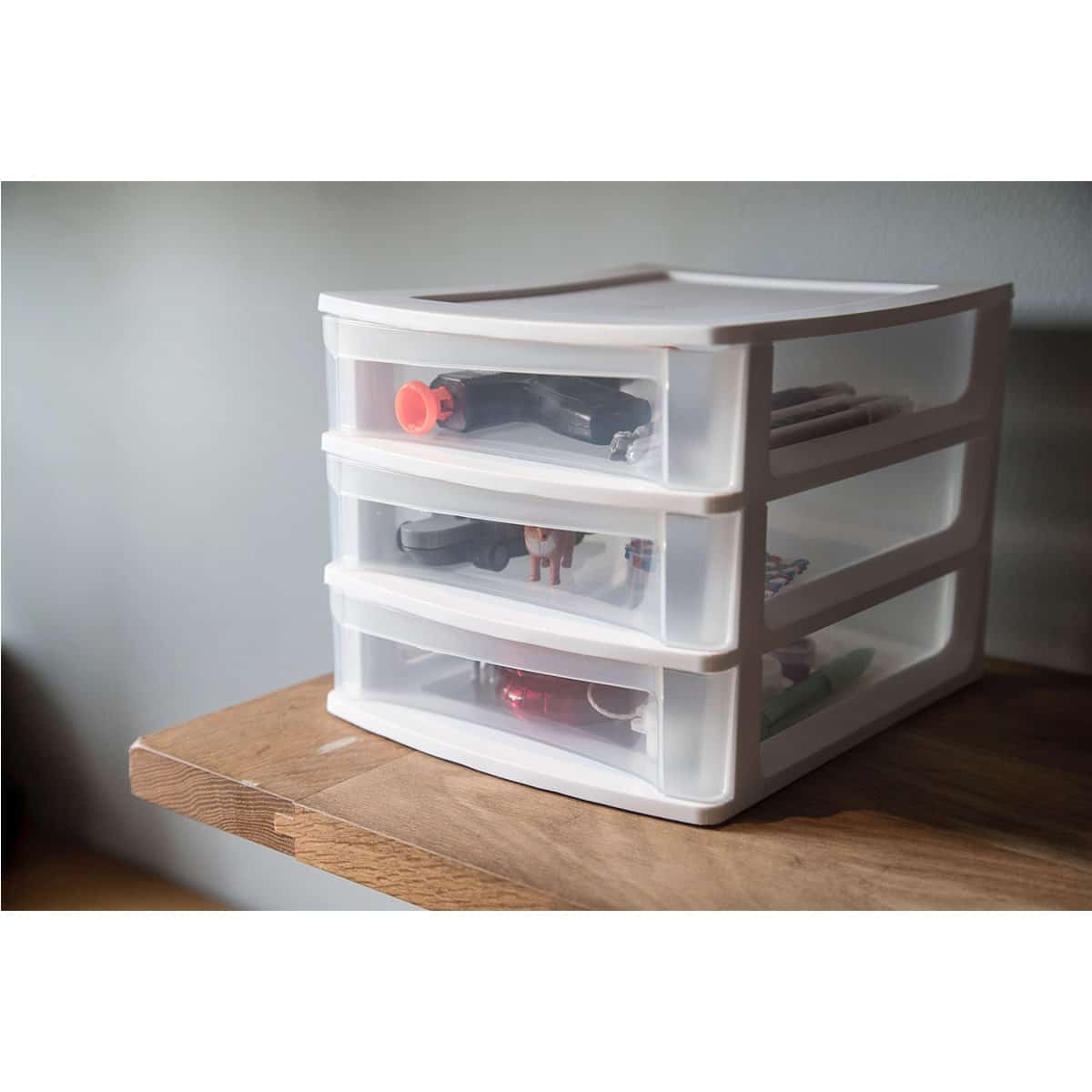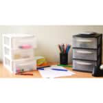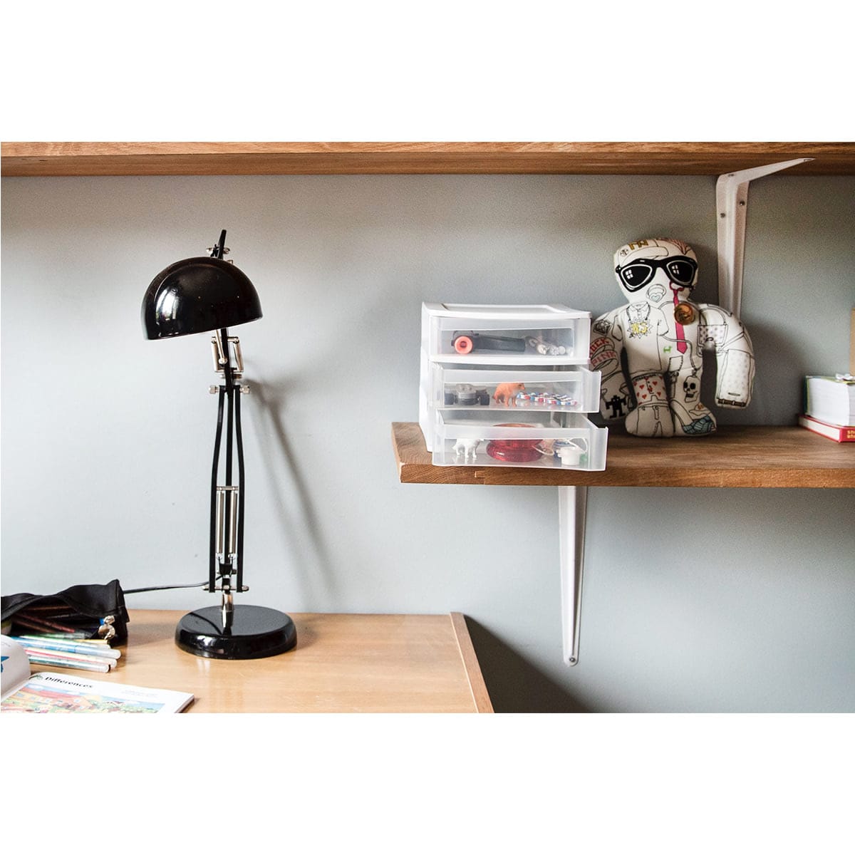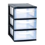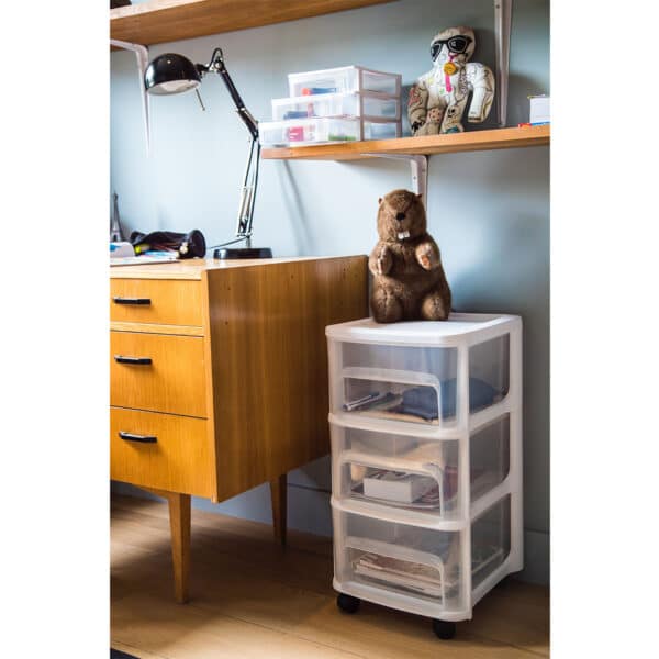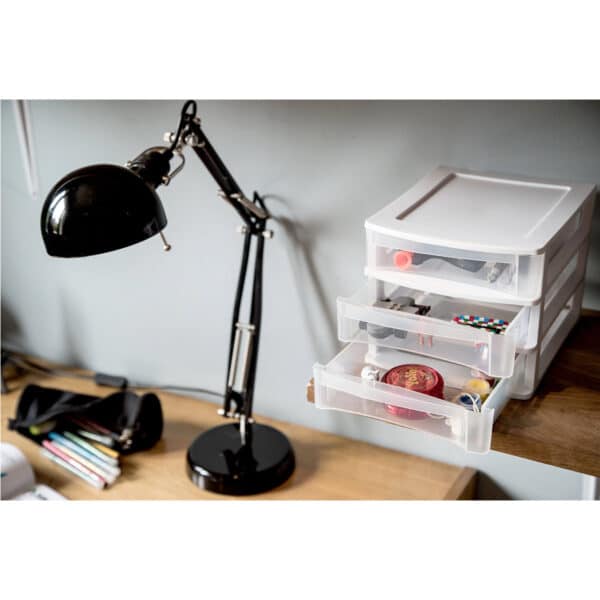 Moduliniai baldai – tai visas išdėstymo galimybių spektras. Paprastų sprendimų dėka galime sudaryti bet kokios konfigūracijos rinkinius. Jos skirtos tvarką, tvarką, kokybę ir naudojimo patogumą vertinantiems žmonėms. Norint efektyviai sutvarkyti vietą ant stalo, tereikia šio nedidelio trijų stalčių modulio, kuriame galėsite laikyti užrašus, rašiklius, žirkles ar sąvaržėles. Jį galite padėti ant lentynos ir joje laikyti kompaktinius diskus, įkroviklio laidus, USB atmintines ar dokumentus. Tokio nedidelio sprendimo dėka darbo ar mokymosi vietą galime padaryti tvarkingą, palankią susikaupti ir skatinančią kūrybiškumą. Nepakeičiamas jaunimo kambaryje, bendrabutyje ar biure. Jie užima mažai vietos, o dėl to, kad juos galima derinti vienas su kitu, dėti vieną ant kito arba atskirai, patalpą galima sukurti pagal savo poreikius. Tinka A5 formatui.Patogi ištraukiama rankena.Antikritimo stabdymas.Galima sukrauti su kitais šios serijos modeliais Spalva: skaidri / juoda Matmenys: 27,5 (A) x 28,0 x 18,0 cm Medžiaga: polipropilenas
