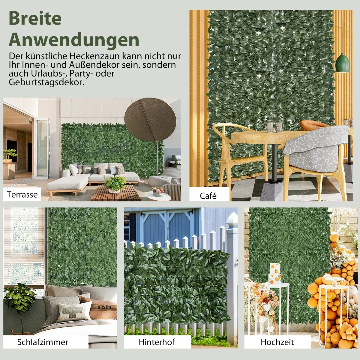 Dirbtinė gyvatvorė 300x100cm žalios spalvos yra praktiškas sprendimas siekiant sukurti privatumo ekraną tiek vidaus, tiek lauko erdvėse. Natūraliai atrodančių lapų dėka ji suteikia žalumos ir apsaugo nuo pašalinių žvilgsnių be būtinybės nuolatinės priežiūros.
