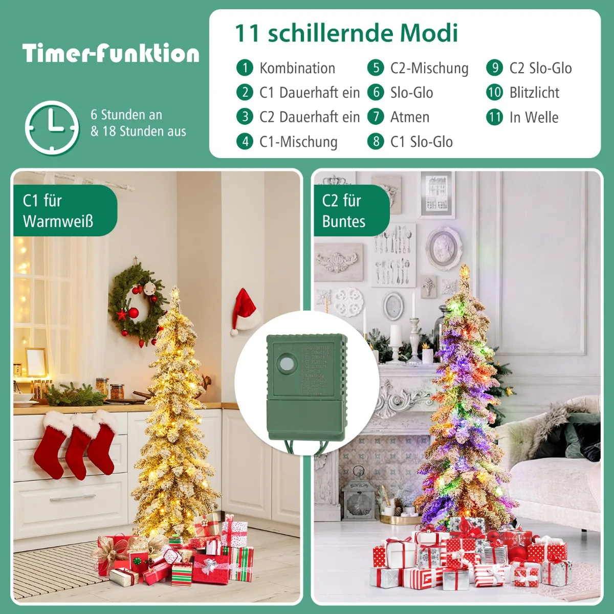 - Iki 100 LED lempučių su dviem apšvietimo režimais: šiltai balta (C1) ir spalvinga (C2).