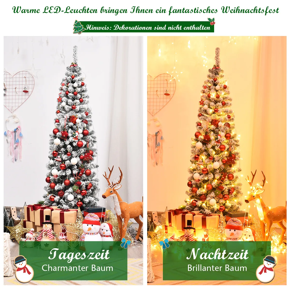 Dirbtinė LED eglė 61x180cm, žalios ir baltos spalvos, puikiai tiks Kalėdų dekoravimui mažose erdvėse ar kampuose. Ši pieštuko formos Kalėdų eglė su apsnigtomis PVC šakomis ir 250 šiltų LED lempučių suteiks jūsų namams žiemišką atmosferą.