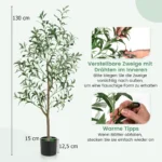 Dirbtinis alyvmedis 15x130cm yra puikus sprendimas interjerui atnaujinti be papildomos priežiūros. Šis 130 cm aukščio dirbtinis augalas su žaliais lapais ir tikroviškais alyvuogių vaisiais tinka namams, biurams, balkonams ir kitoms erdvėms. Dėl tvirto cemento vazonu ir reguliuojamų šakų, alyvmedį lengva pritaikyti pagal savo poreikius.
