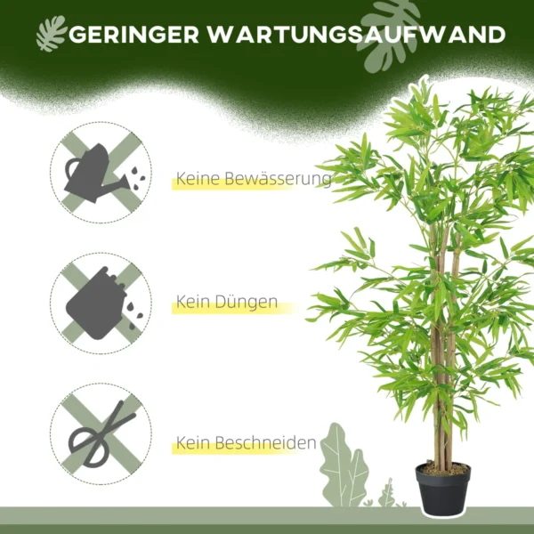 Mūsų dirbtinis bambukas iš Outsunny yra idealus pasirinkimas, jei mėgstate žalius augalus, bet turite mažai laiko priežiūrai. Jis daugelį metų išlieka žalias be drėkinimo ar tręšimo. Gyvybiški dirbtinių augalų lapai vazone sukuria natūralią atmosferą, o augalas dera su bet kokia puošmena, tiek patalpoje, tiek lauke.