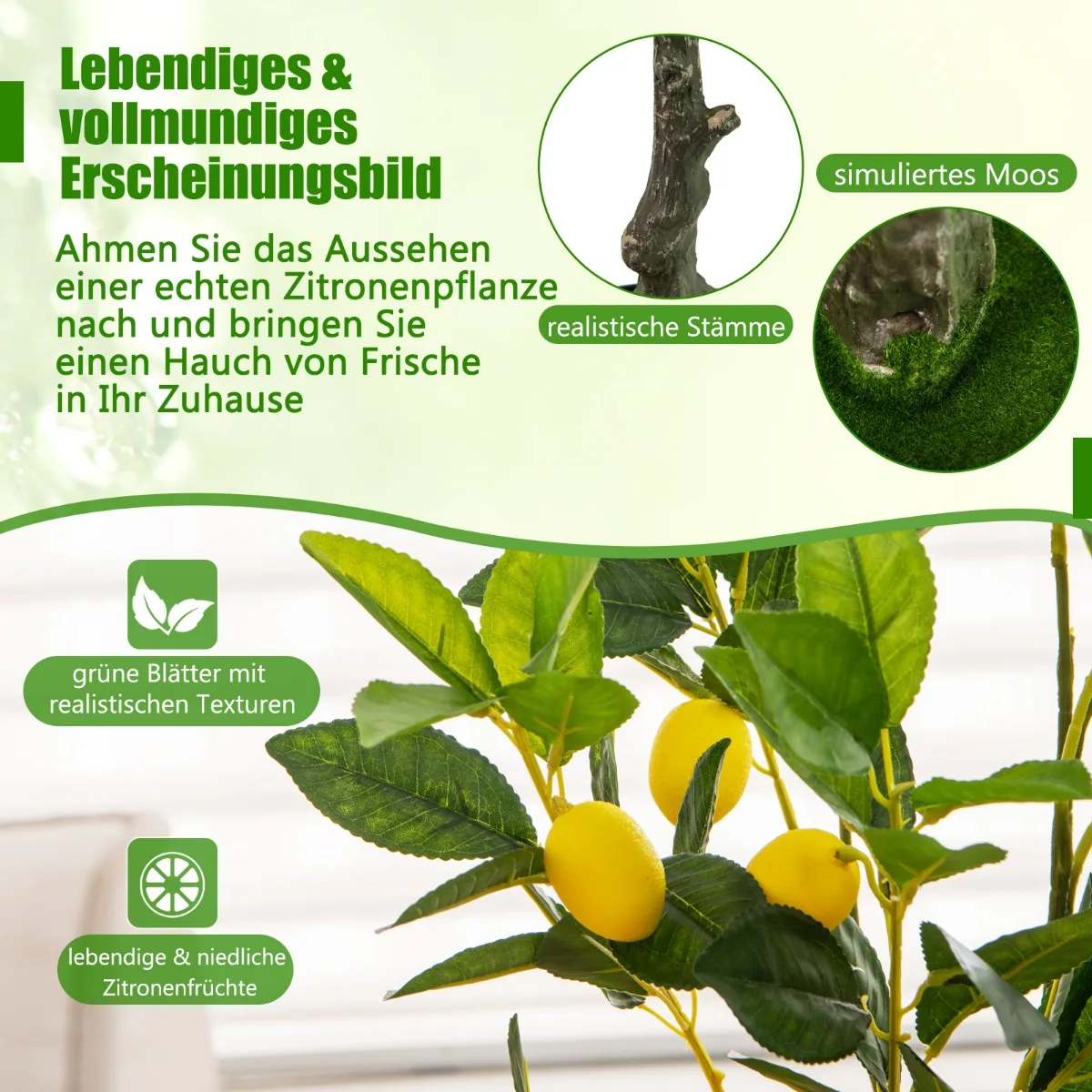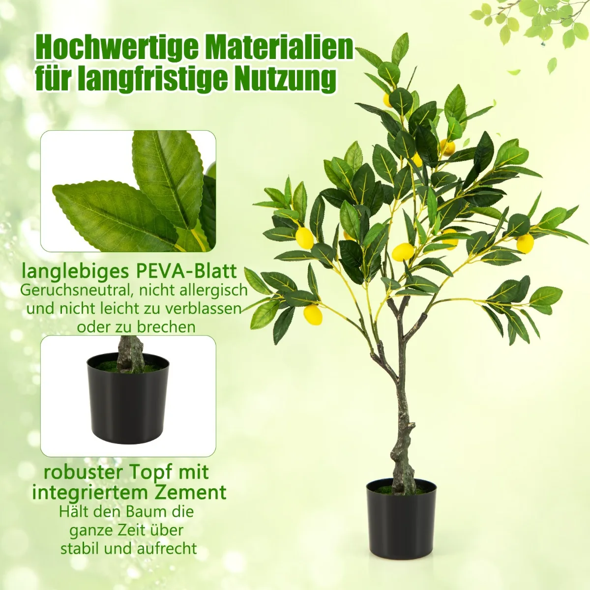 Dirbtinis citrinmedis aukščio 80 cm puikiai papuoš jūsų namų, biuro ar kitos vidaus erdvės interjerą. Šis dirbtinis vaismedis išsiskiria natūralia išvaizda, tikroviškais citrinų vaisiais bei žaliais PEVA lapais, kurie nereikalauja jokios priežiūros.
