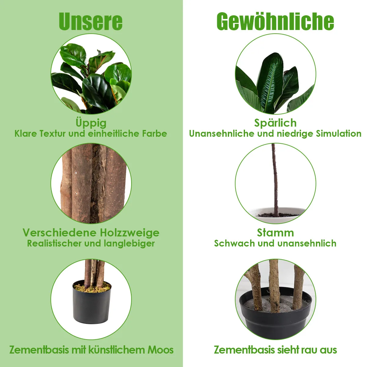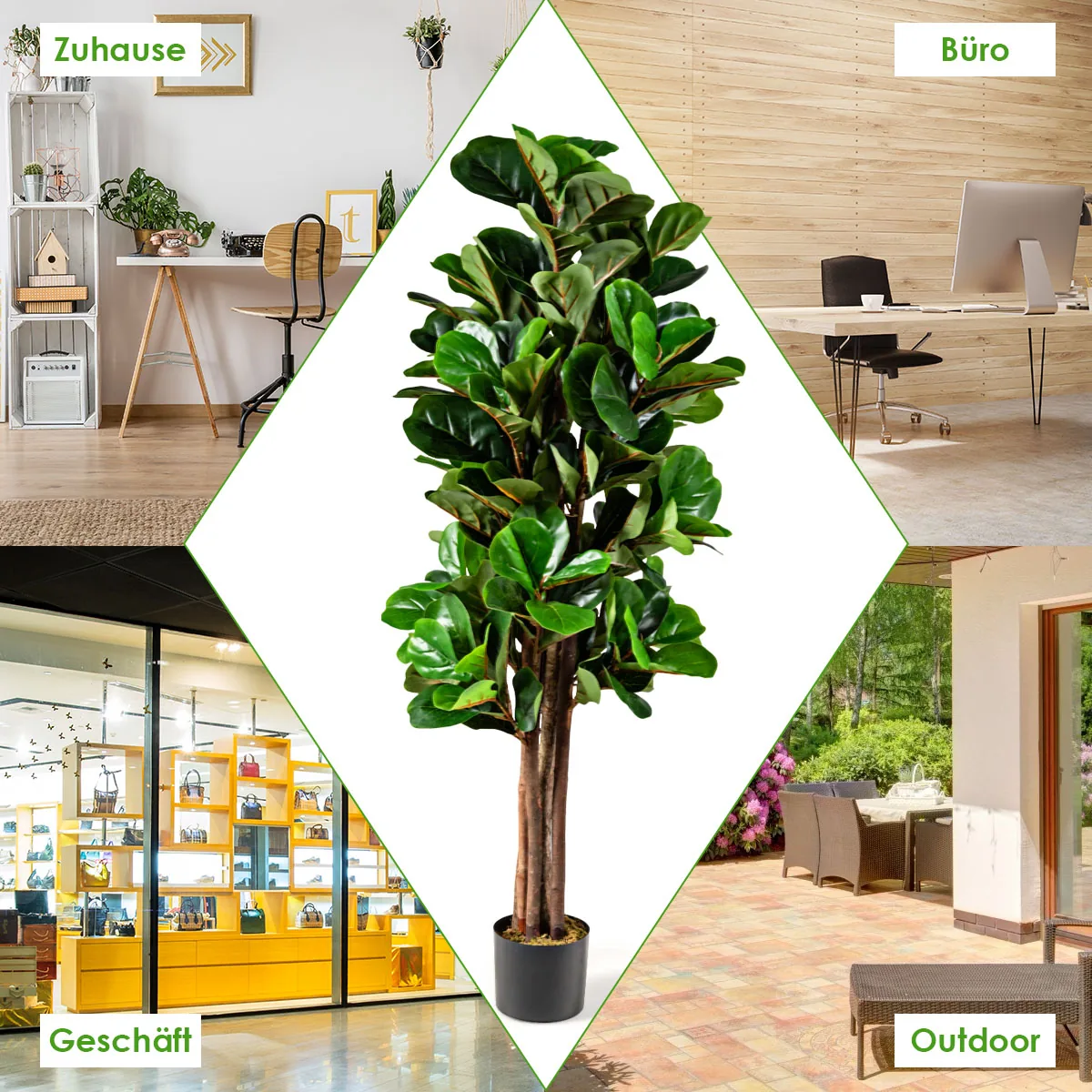 - 1,5 m aukščio dirbtinis fikusas su 180 lapų, suteikiančių gamtos atspalvį patalpoms.