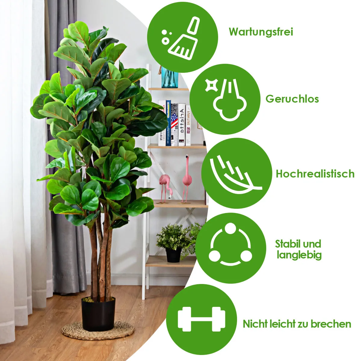 - Tvirtas kamienas ir natūraliai atrodantys lapai sukuria tikrovišką figmedžio iliuziją.