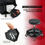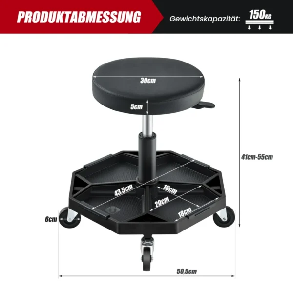 Dirbtuvių kėdė 50,5×50,5x55cm, juodos spalvos, skirta patogiam darbui dirbtuvėse ar remontui. Reguliuojamas aukštis ir pasukama sėdynė užtikrina patogumą įvairiems darbams, o ratukai leidžia lengvai judėti.