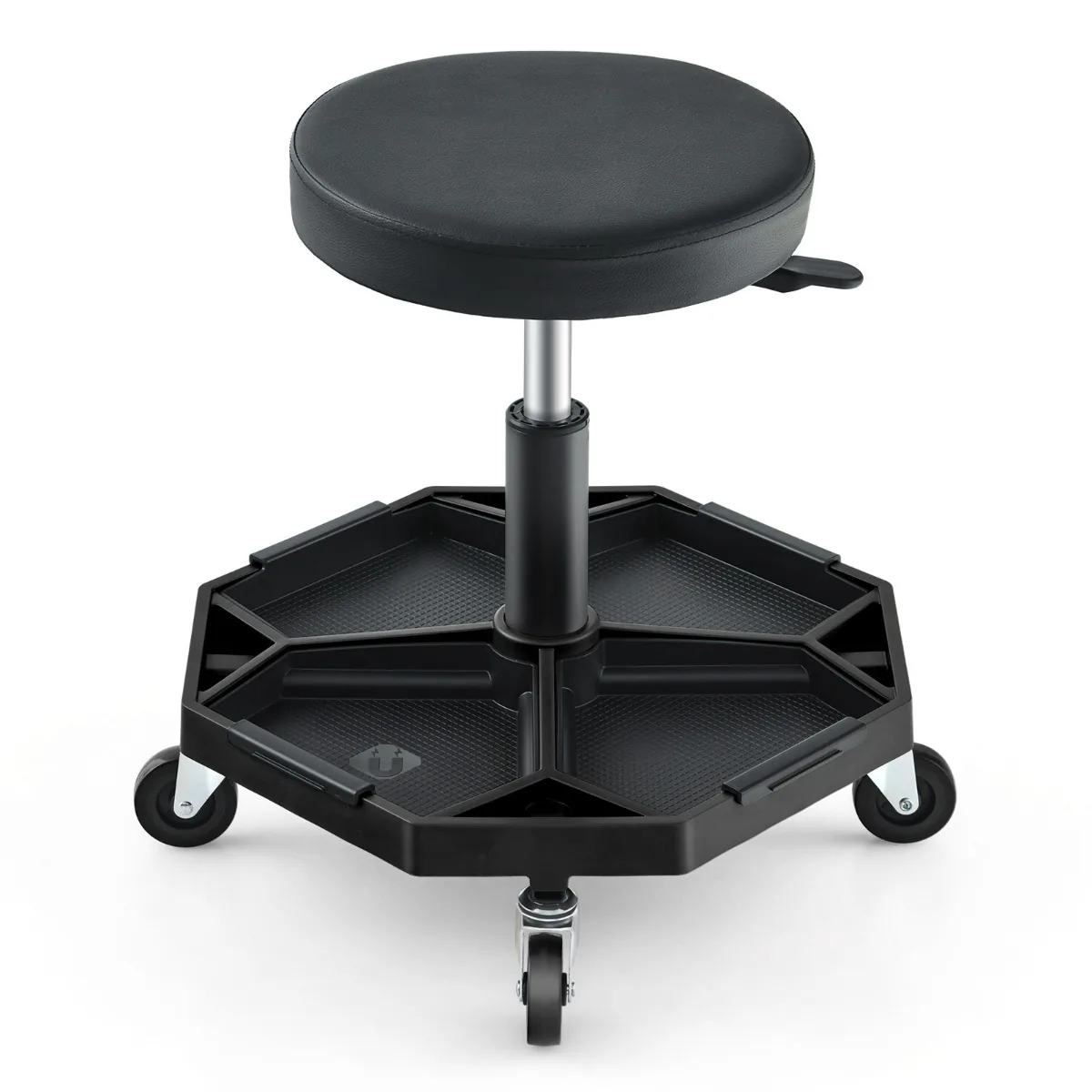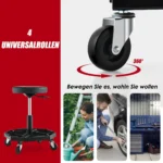 - Pneumatinė riedanti mechaninė taburetė su 360° pasukama sėdyne ir minkšta paminkštinta dalimi.
