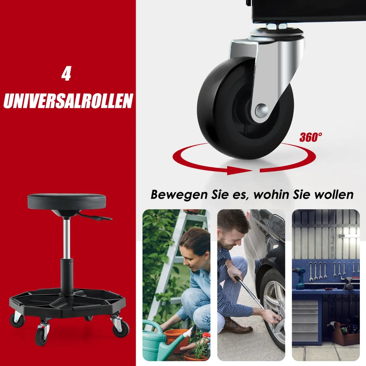 - Keturi universalūs ratukai užtikrina laisvą judėjimą dirbtuvėse ar kitose darbo aplinkose.
