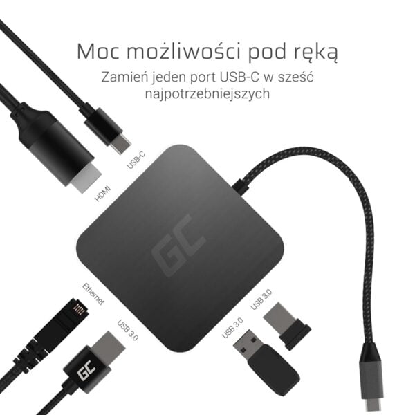 Dar daugiau galimybių su GC HUB2 adapteriu. Paverskite vieną USB-C prievadą į 6 būtiniausius (HDMI, Ethernet, 3x USB 3.0, USB-C) ir padarykite nešiojamojo kompiuterio naudojimą dar patogesnį ir efektyvesnį. Greitas nešiojamojo kompiuterio ir išmaniojo telefono įkrovimas tiesiogiai per HUB dėl „Pass-through“, „Power Delivery“ (87 W) technologijos ir „Quick Charge 3.0 / 4.0“ palaikymoĮrenginys užtikrina suderinamumą su bet kokiu įrenginiu, turinčiu USB-C prievadą, leidžia dar efektyviau dirbti. GC HUB 2 taps ypač naudingas naujausių nešiojamųjų kompiuterių, turinčių tik C tipo USB prievadus, savininkams.Vieną USB-C prievadą paverskite šešiais būtiniausiais, kad padidintumėte savo įrenginio galimybes ir atliktumėte daugiau darbų. efektyvus. Viskas dėl saugios, pažangios elektronikos.Dėl papildomos 1 Gbps Ethernet jungties įdiekite dar greitesnį internetą savo įrenginyje. Pamirškite prastą Wi-Fi aprėptį ir mėgaukitės greitu duomenų perdavimu bei įgykite pranašumą prieš savo priešininkus tinkle dėl sklandaus ir stabilaus interneto ryšio.GC HUB2 adapterio dėka išnaudosite visas galimybes savo išmaniajame telefone su DEX, Huawei EMUI Desktop arba PC Mode technologija. Prijungę pelę, klaviatūrą ir maitinimo šaltinį, naudosite jį kaip standartinį kompiuterį.Siųskite vaizdą iki 4K raiškos. Prijunkite papildomą monitorių arba projektorių, kad išnaudotumėte visas kompiuterio ar išmaniojo telefono galimybes ir gautumėte geriausią vaizdo kokybę.GC HUB2 visiškai pakeičia Nitendo stoties funkcionalumą. Įkelkite savo „Switch“ vaizdą ir perkelkite pramogas į kitą lygį. Dėl mažo adapterio dydžio jį lengva pasiimti į kiekvieną kelionę ir leisti mėgstamus kūrinius dideliame ekrane.Suderinamas su naujausiais ultrabooks, įskaitant:· Apple Macbook Air 2018, Macbook Pro 2016/2017/2018,Dell XPS 13/15,Huawei MateBook X Pro,Lenovo X1 Carbon, Asus ZenBook 3,· Microsoft Surface Book 2Produkto funkcijos:· Prievadai: 3xUSB 3.0, HDMI 4K (30Hz), Ethernet 1Gbps, USB-C· Integruotas USB-C laidas· Maitinimo tiekimo funkcija· Apsauga nuo viršįtampio