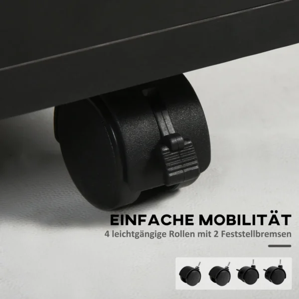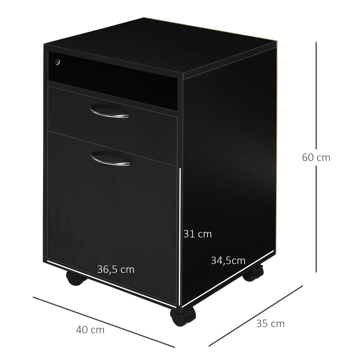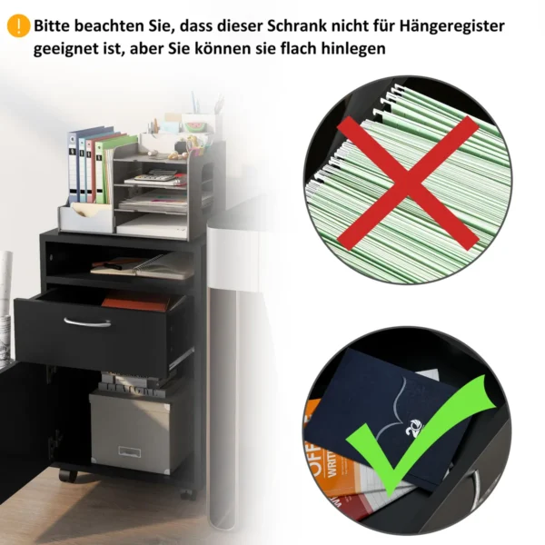 Šis HOMCOM susukamas konteineris siūlo daug vietos saugykloje ir saugojimo vietos viename. Atvira lentyna, 1 stalčius ir spintelė suteikia daug vietos biuro reikmenims, aplankams ir dokumentams. Dėl 4 besisukančių ratų jį galima lengvai perkelti pirmyn ir atgal. Nesvarbu, ar jis skirtas biurui, studijoms ar svetainei – šis sukiojantis HOMCOM konteineris turi daug vietos.