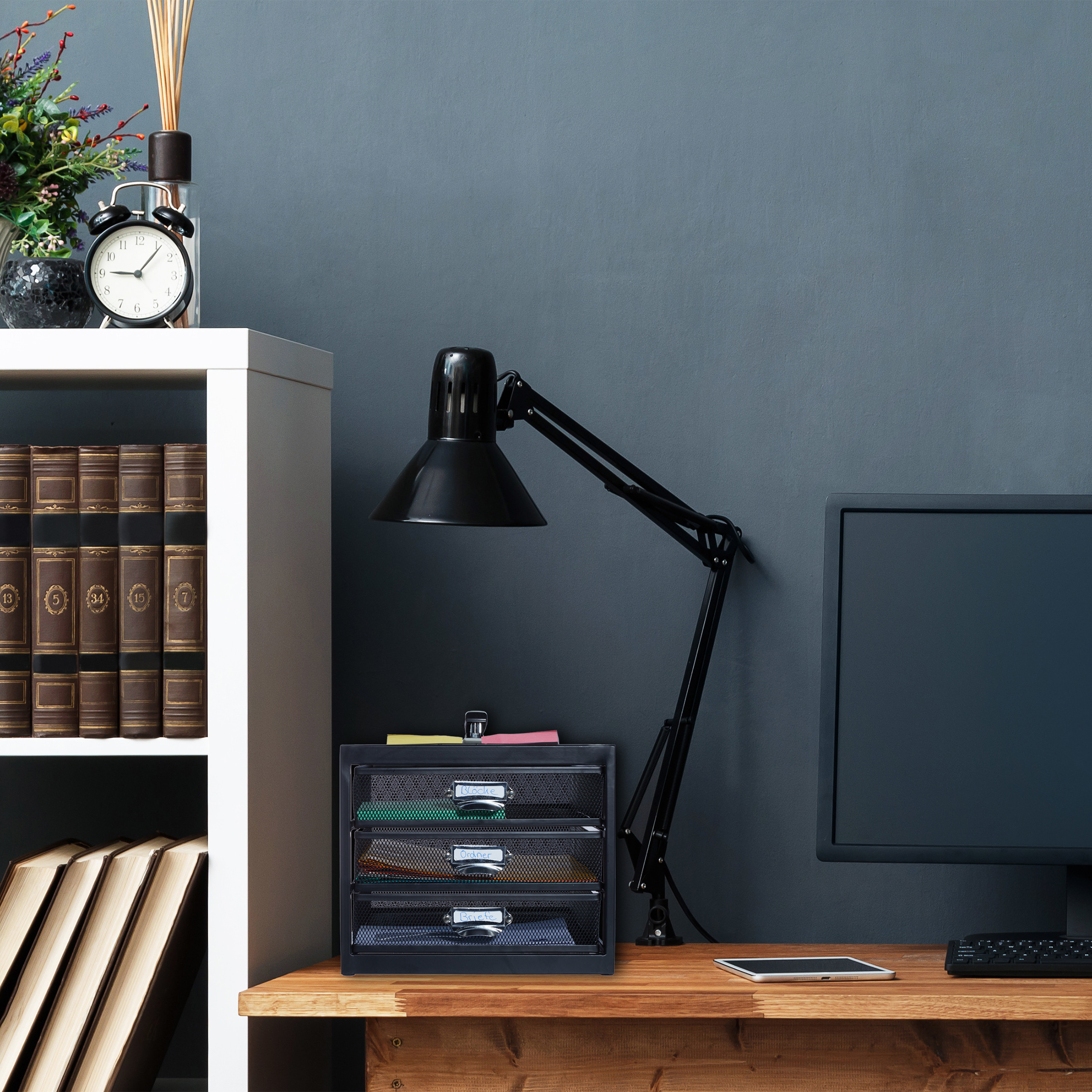 - Dydis: 23×27,5×35 cm – kompaktiškas, bet talpus dizainas, puikiai tinkantis bet kokiam stalui.