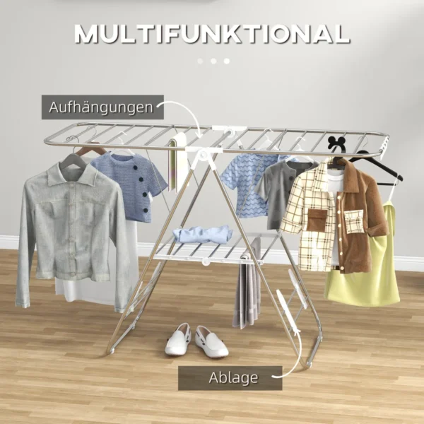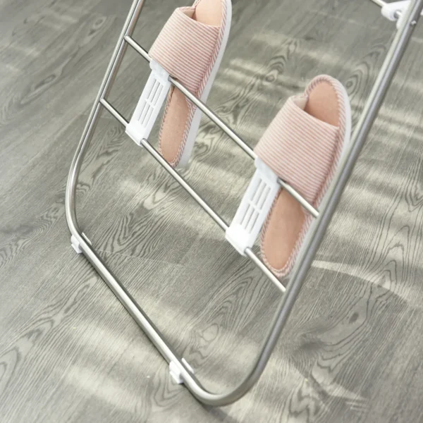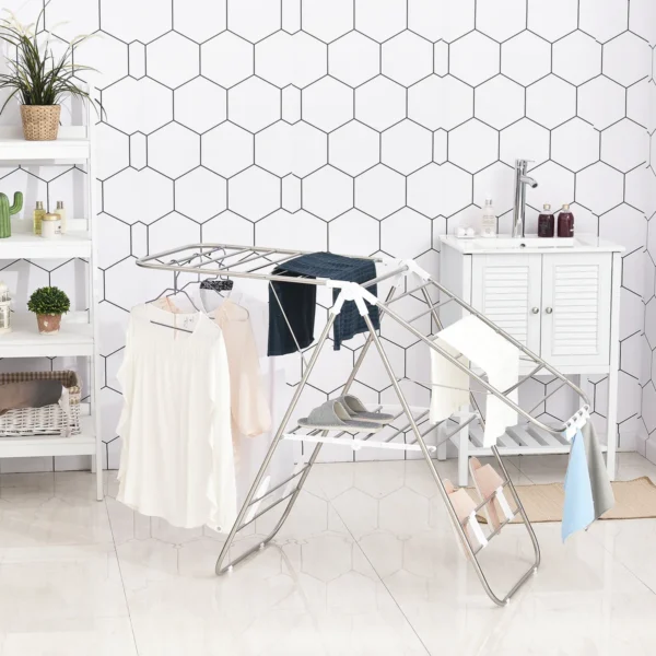 HOMCOM džiovinimo stovas suteikia daug vietos rūbams ir rankšluosčiams džiovinti. Ypatingas posūkis: be dviejų sparnų, pats stovas taip pat turi skersines petnešas, ant kurių galite pakabinti skalbinius. Drabužių vėdyklė yra pagaminta iš nerūdijančio plieno ir neslidi dėl guminių pagalvėlių apačioje. Sulenktą galite laikyti, kad sutaupytumėte vietos. Praktiškas ir patvarus pagalbininkas buityje!