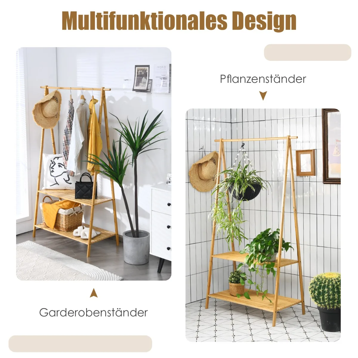 Drabužių kabykla 101x45x160cm, šviesiai rudos spalvos, pagaminta iš natūralaus bambuko, yra praktiškas sprendimas drabužių, batų ir aksesuarų laikymui. Ši paltų kabykla su dviem lentynom apačioje puikiai tinka koridoriui, prieškambariui ar miegamajam, užtikrinant tvarką ir taupant erdvę.