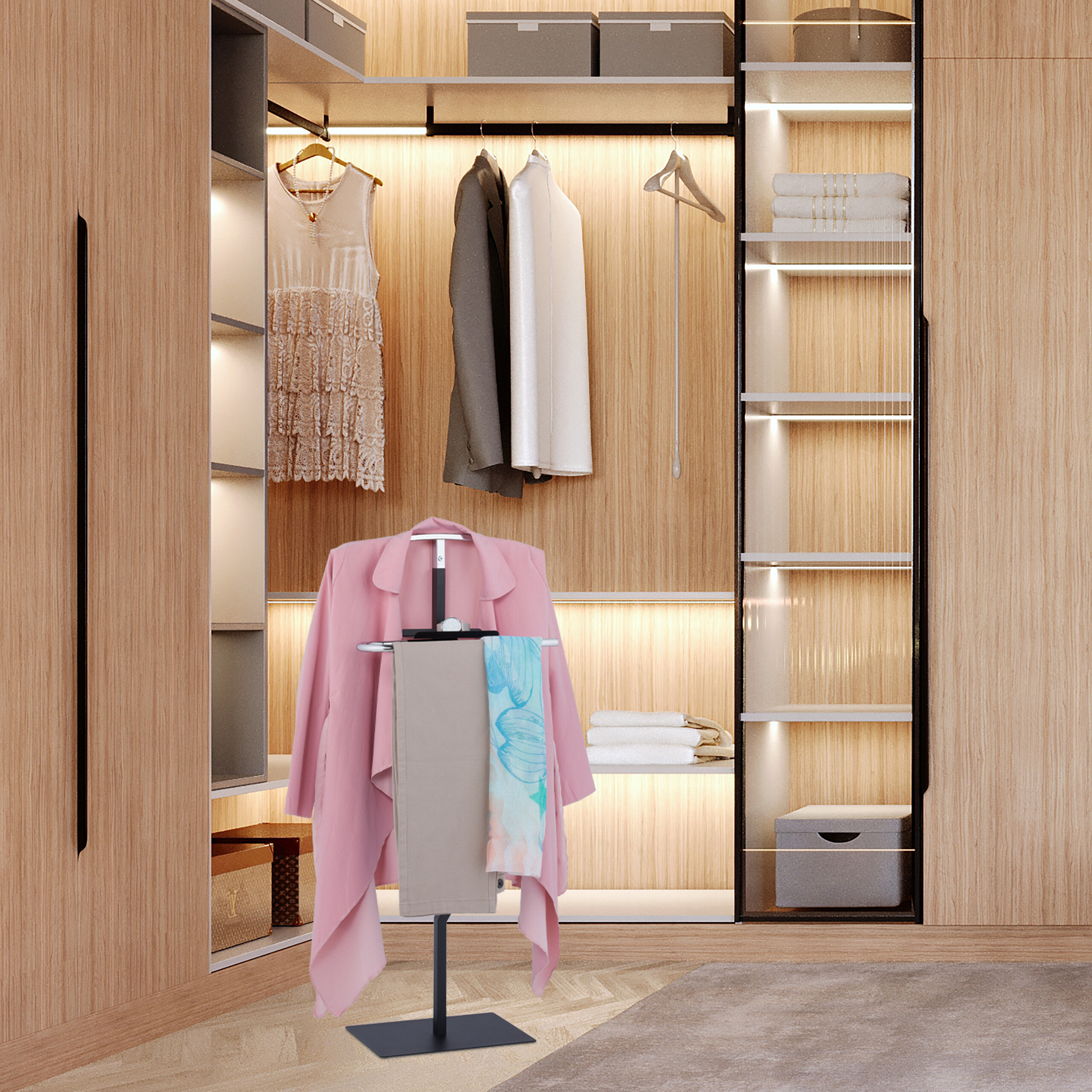 Pristatome elegantišką ir funkcionalią drabužių kabyklą, kuri taps nepakeičiamu jūsų miegamojo, persirengimo kambario ar koridoriaus akcentu. Ši kabykla ne tik padės išlaikyti jūsų drabužius tvarkingus ir nesiglamžančius, bet ir suteiks jūsų interjerui modernumo ir stiliaus.