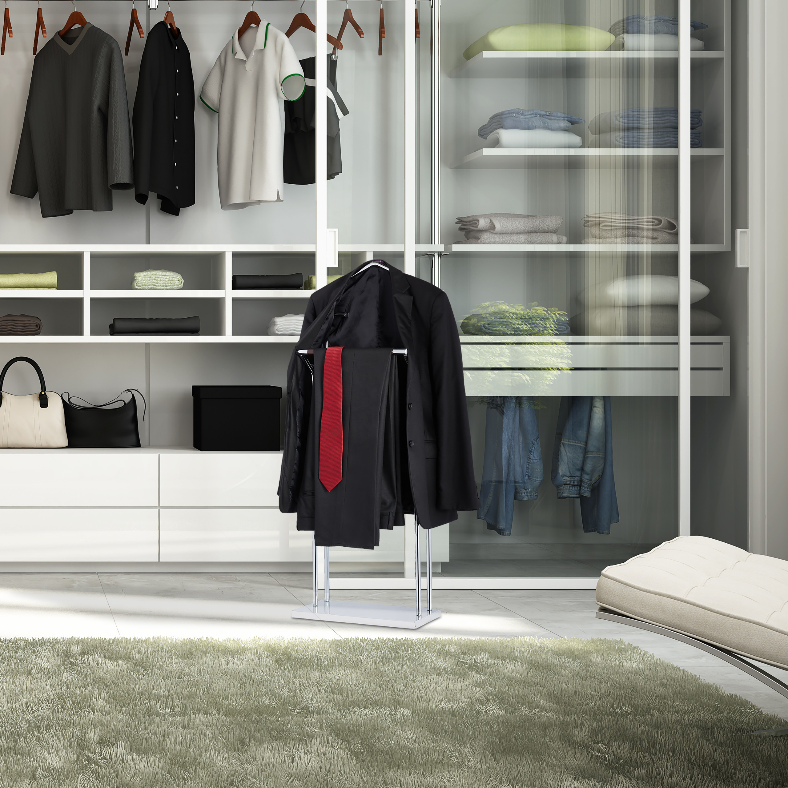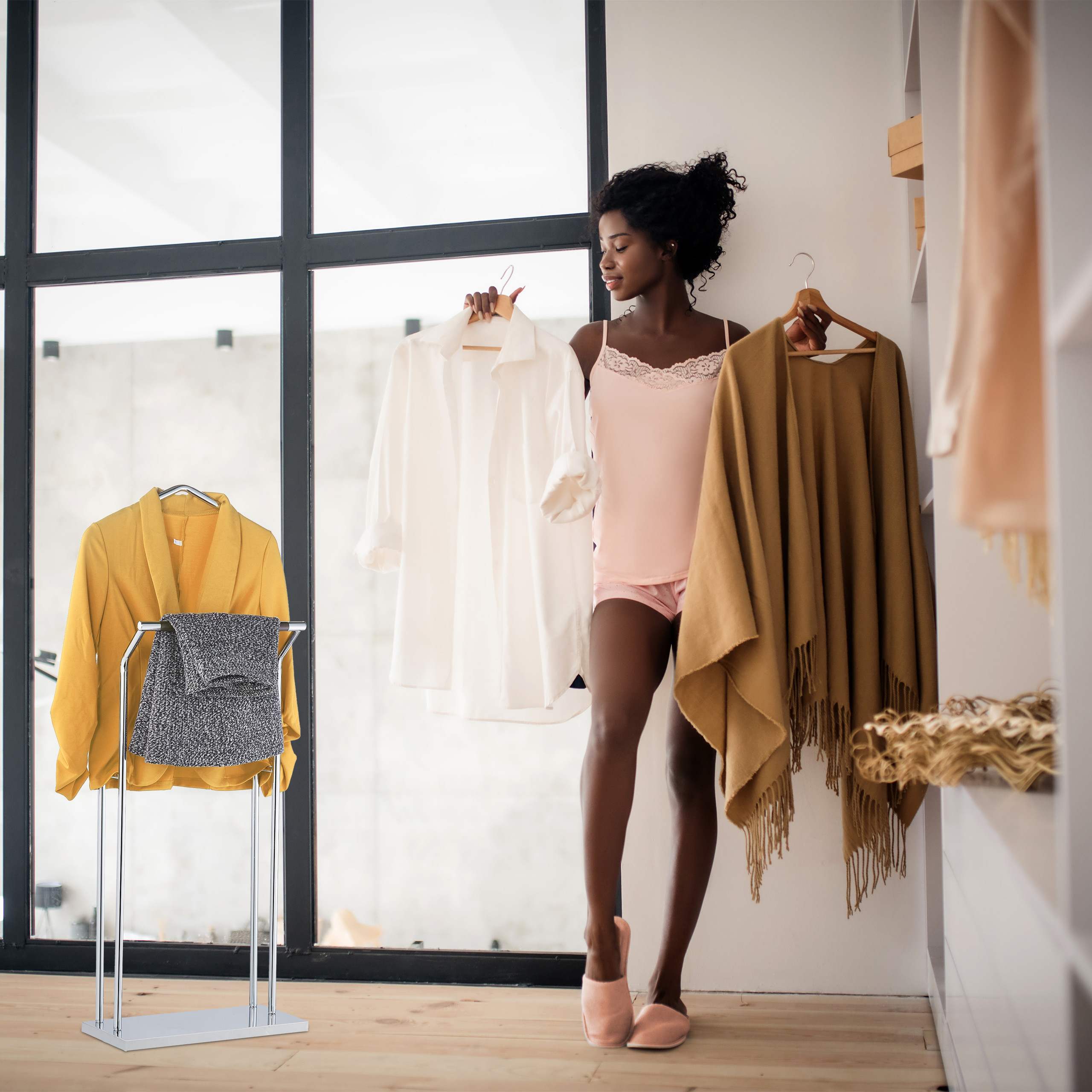 - Funkcionalumas: Dviejų strypų konstrukcija leidžia patogiai pakabinti tiek striukes, tiek kelnes, išlaikant jas nesusiraukšlėjusias.