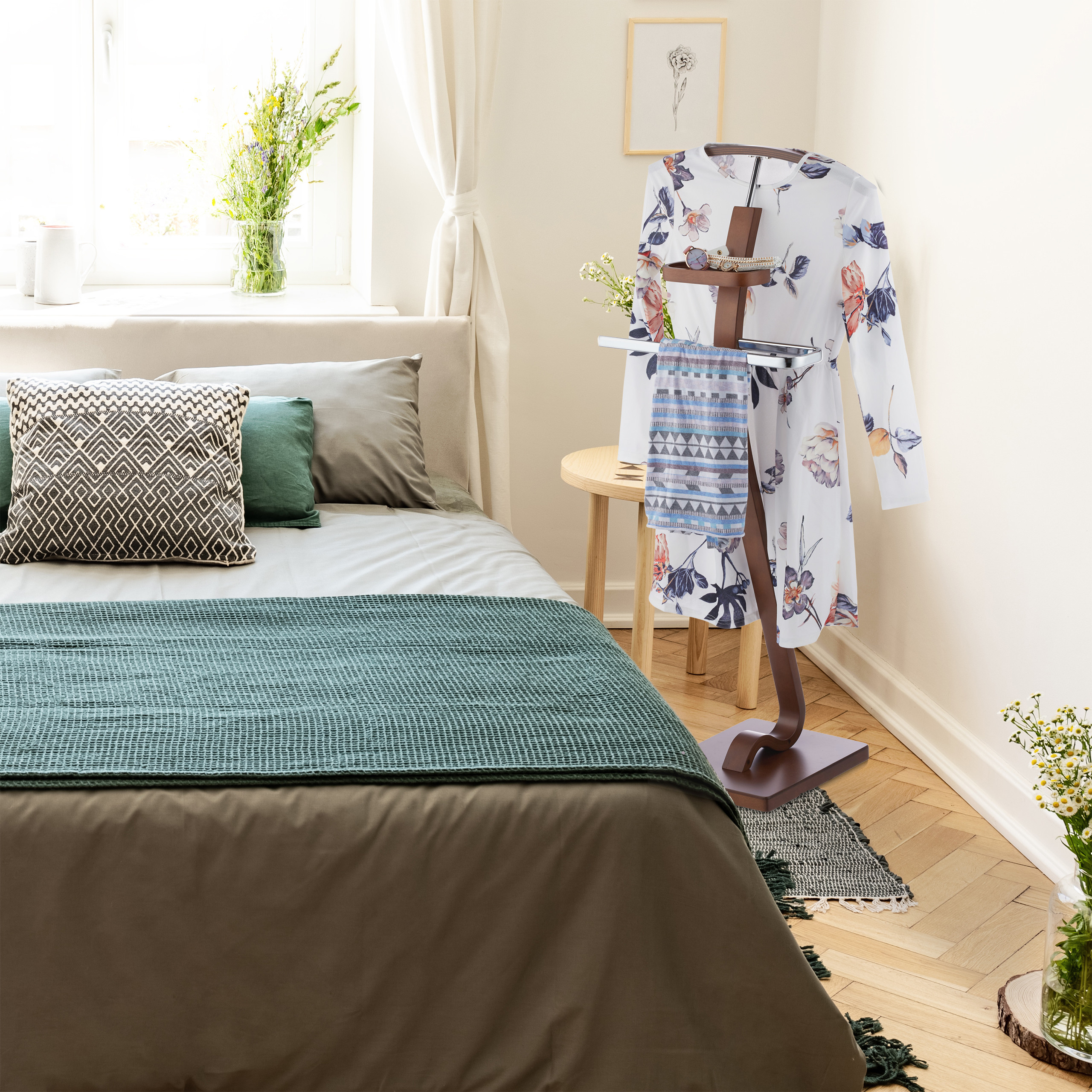 Elegantiška apranga atrodo nepriekaištingai tik tada, kai ji nėra susiraukšlėjusi ar susiglamžusi. Mūsų laisvai stovintis drabužių patarnautojas yra puikus sprendimas, padedantis išlaikyti jūsų drabužius tvarkingus ir paruoštus dėvėjimui. Šis elegantiškas graikinio riešutmedžio spalvos baldas su drabužių kabykla ir kelnių juostele užtikrina, kad jūsų švarkai, marškiniai, palaidinės, kelnės ir sijonai išlaikytų savo formą.