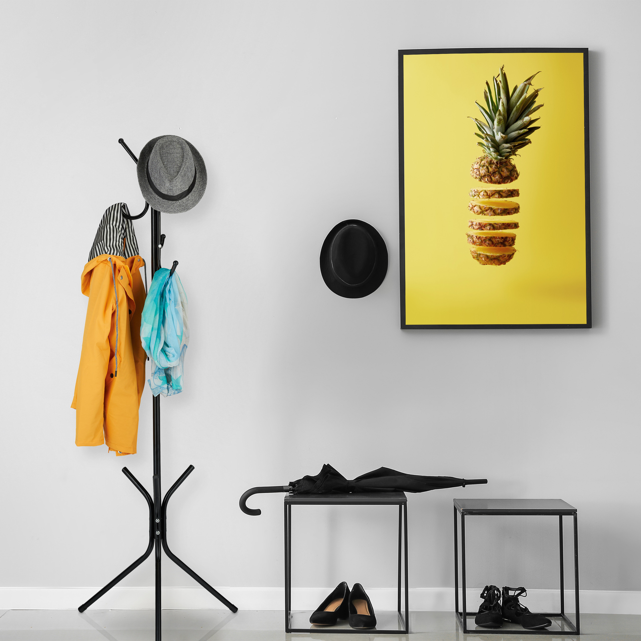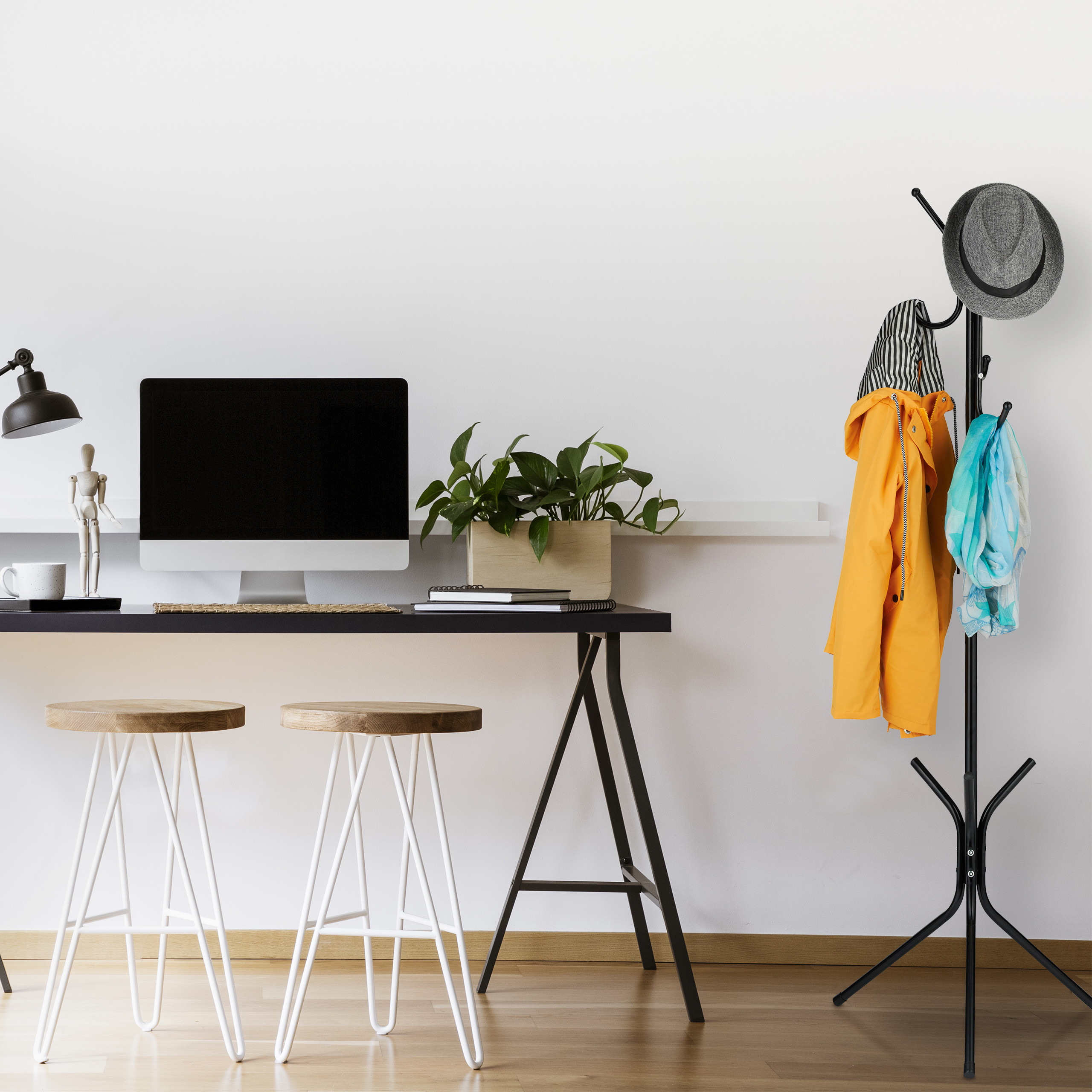 Ši laisvai pastatoma metalinė prieškambario paltų kabykla yra būtinas kiekvieno prieškambario priedas. Jos elegantiškas ir modernus dizainas puikiai dera su bet kokiu interjero stiliumi, suteikdamas jūsų erdvei tvarkos ir estetikos.