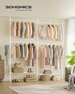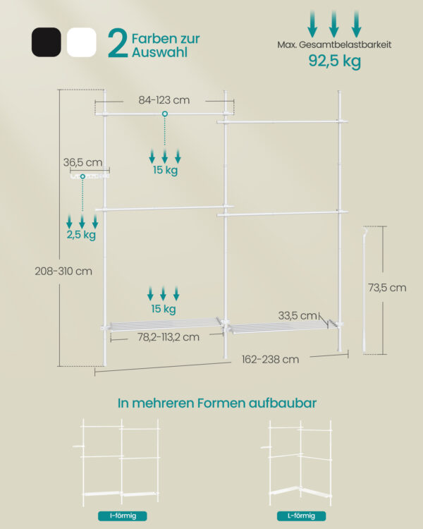 Drabužių kabyklos maksimali statinė apkrova yra 2,5 kg, o kiekvieno lygio – 15 kg. Bendra maksimali statinė apkrova siekia 92,5 kg, užtikrinant, kad jūsų drabužiai ir aksesuarai bus saugiai laikomi.