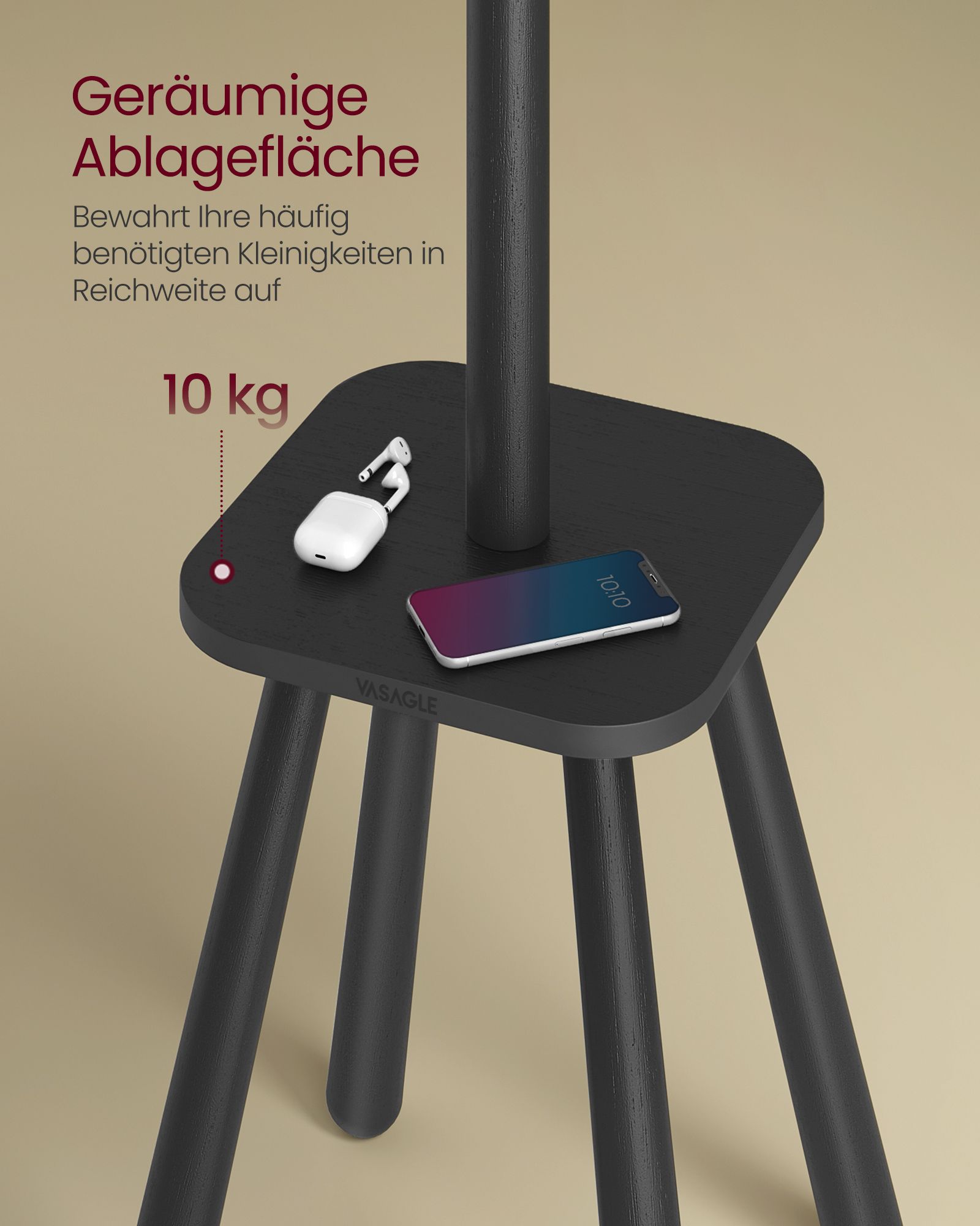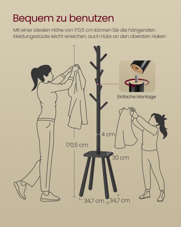 Ši elegantiška drabužių kabykla, kurios matmenys yra 34,7 x 34,7 x 170,5 cm, puikiai tinka jūsų drabužių ir aksesuarų laikymui. Juodos spalvos dizainas suteikia modernumo ir stiliaus jūsų interjerui.
