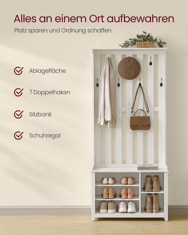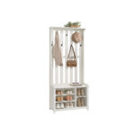 Ši drabužių kabykla, kurios matmenys yra 35 x 81 x 180 cm, yra puikus sprendimas jūsų drabužių ir aksesuarų laikymui. Jos vintažinė balta spalva suteikia elegancijos ir stiliaus jūsų interjerui.