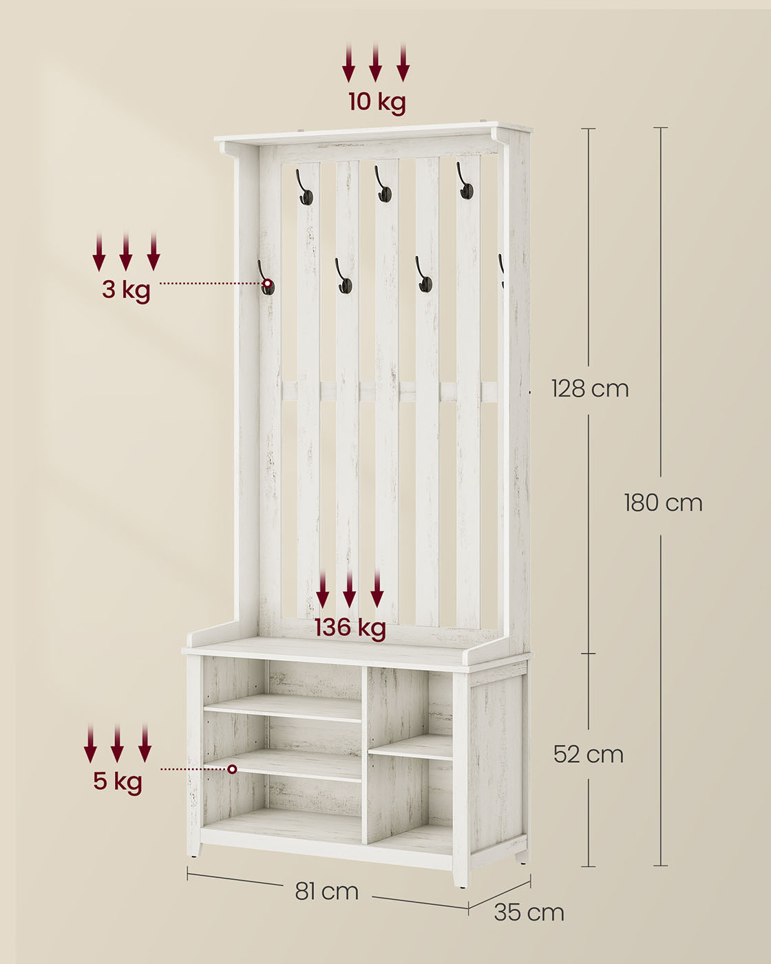 Maksimali suoliuko statinė apkrova yra 136 kg, viršutinės lentynos – 10 kg, kiekvieno dvigubo kablio – 3 kg, o kiekvienos batų lentynos – 5 kg.