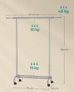 Drabužių kabyklos maksimali strypo statinė apkrova yra 30 kg, o laikymo strypų – 15 kg. Bendra maksimali statinė apkrova siekia 45 kg, todėl galite saugiai laikyti įvairius drabužius ir aksesuarus.