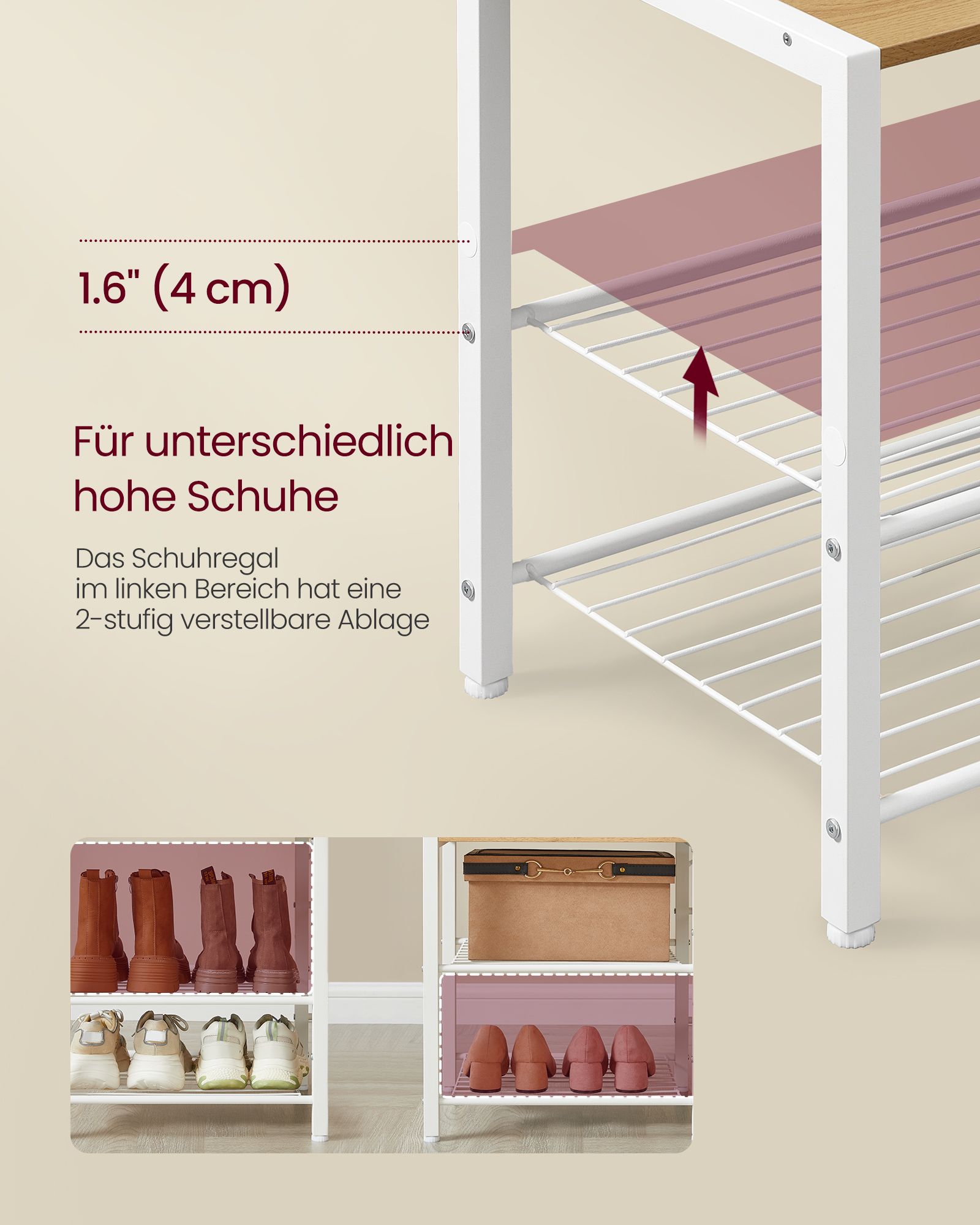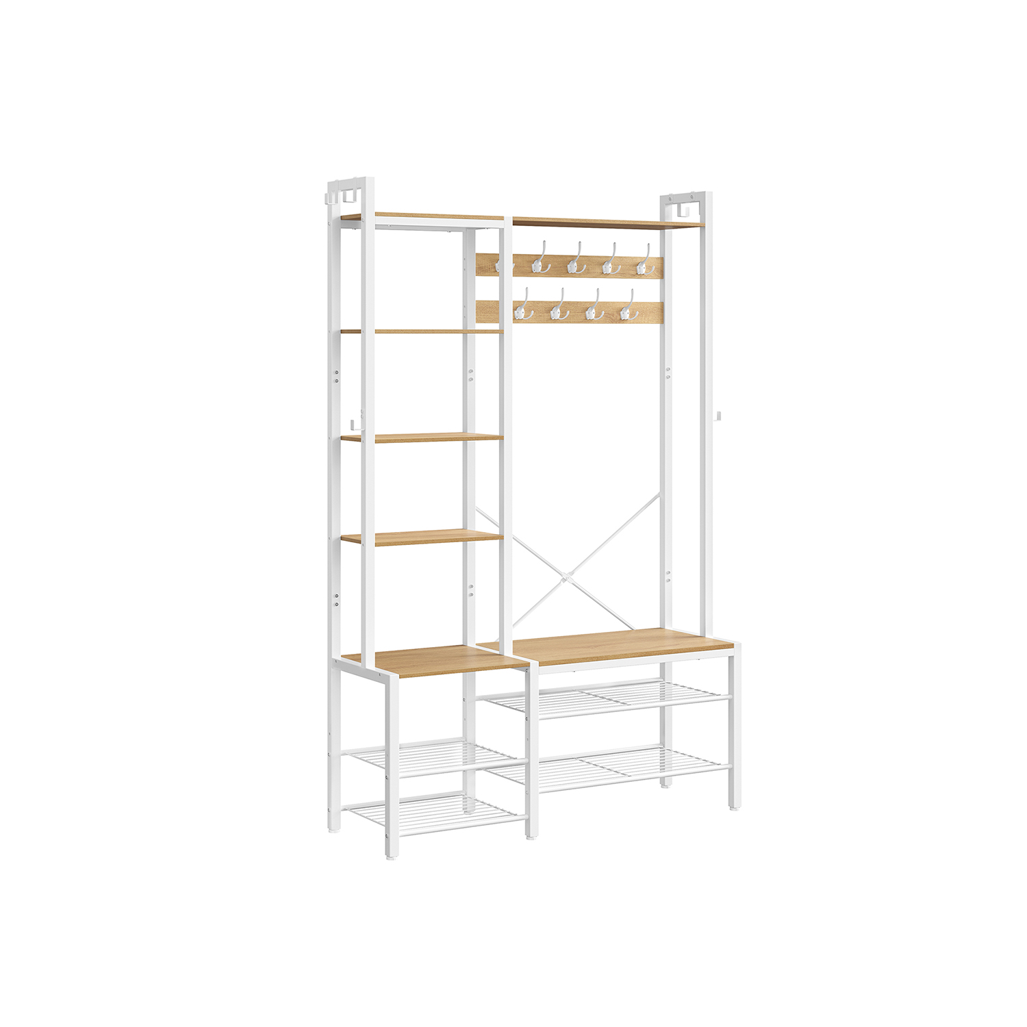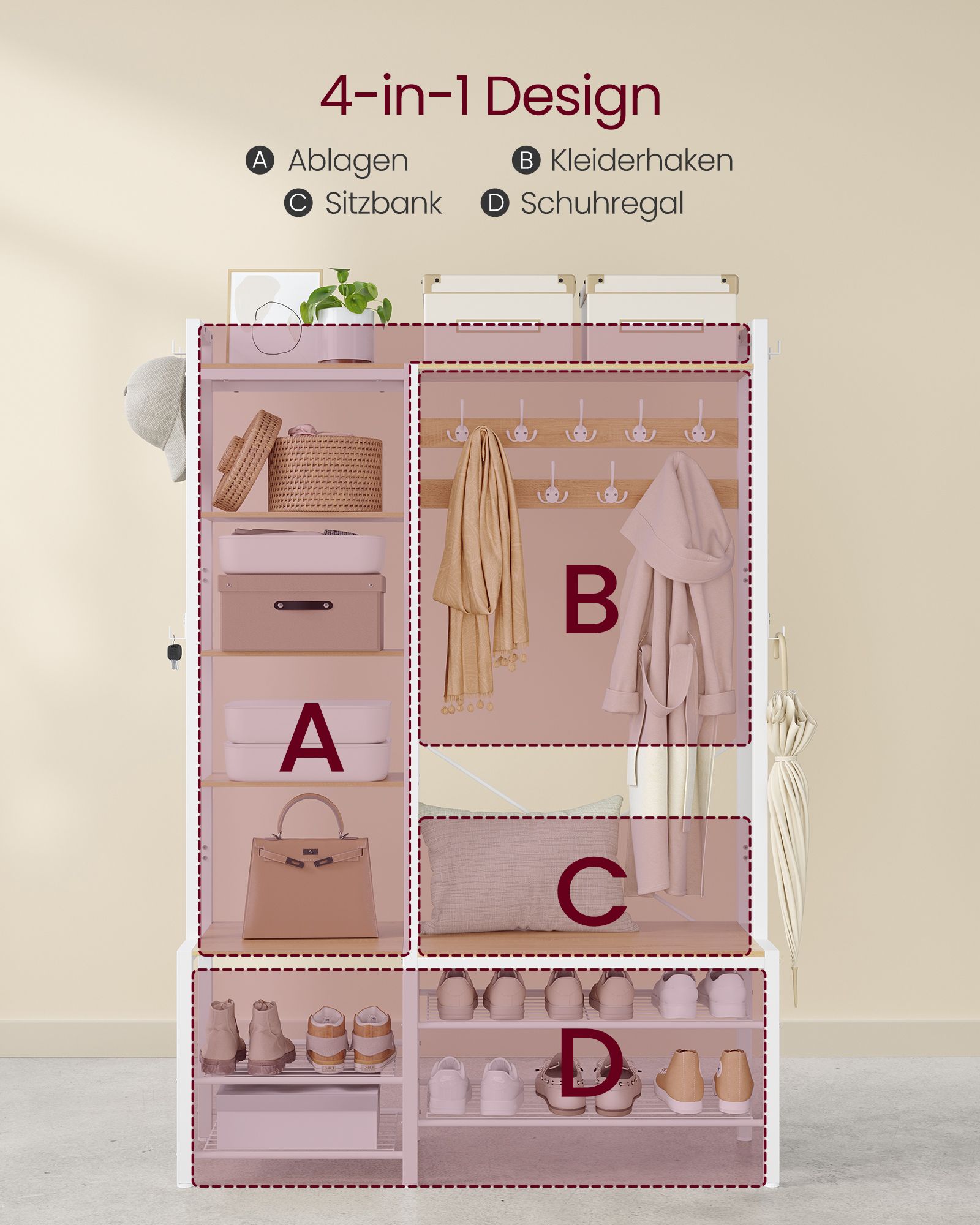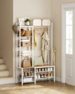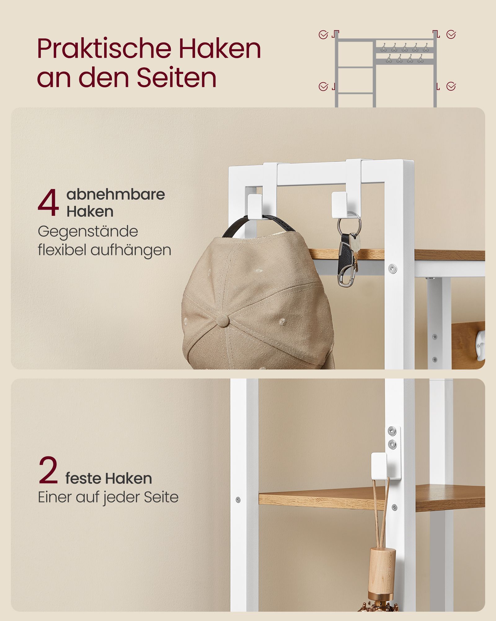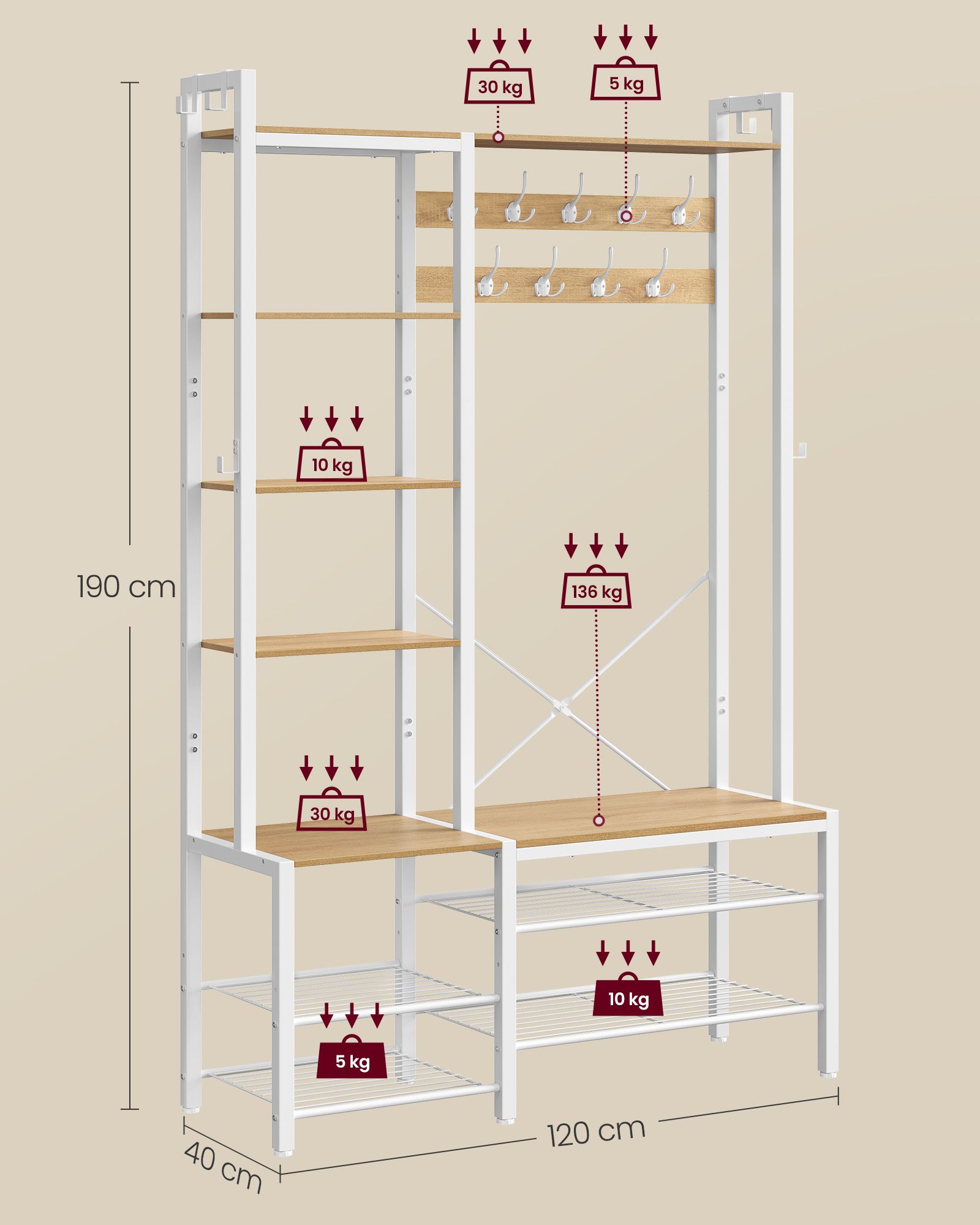 Ši drabužių kabykla, kurios matmenys yra 40 x 120 x 190 cm, yra puikus pasirinkimas jūsų drabužių ir aksesuarų laikymui. Jos šviesiai rudos ir baltos spalvos derinys suteikia elegancijos ir stiliaus jūsų interjerui.