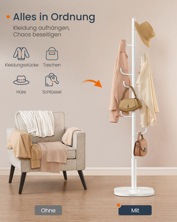 Ši drabužių kabykla, kurios matmenys yra 40 x 40 x 175,3 cm, yra puikus pasirinkimas jūsų drabužių ir aksesuarų laikymui. Jos debesų balta spalva suteikia šviesos ir elegancijos jūsų interjerui.