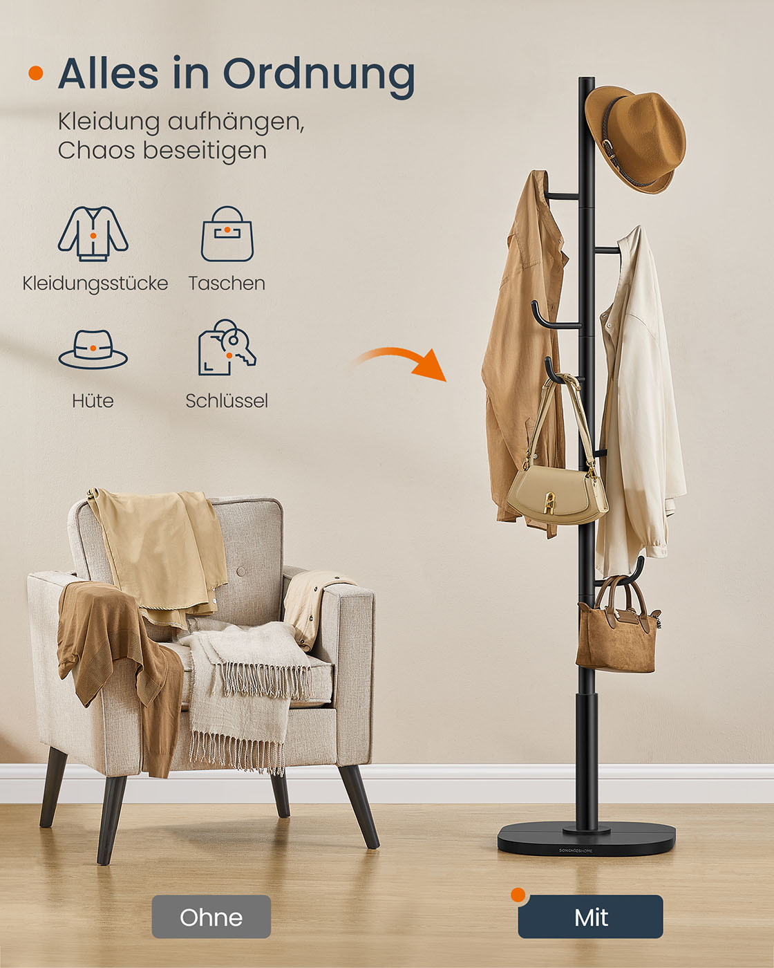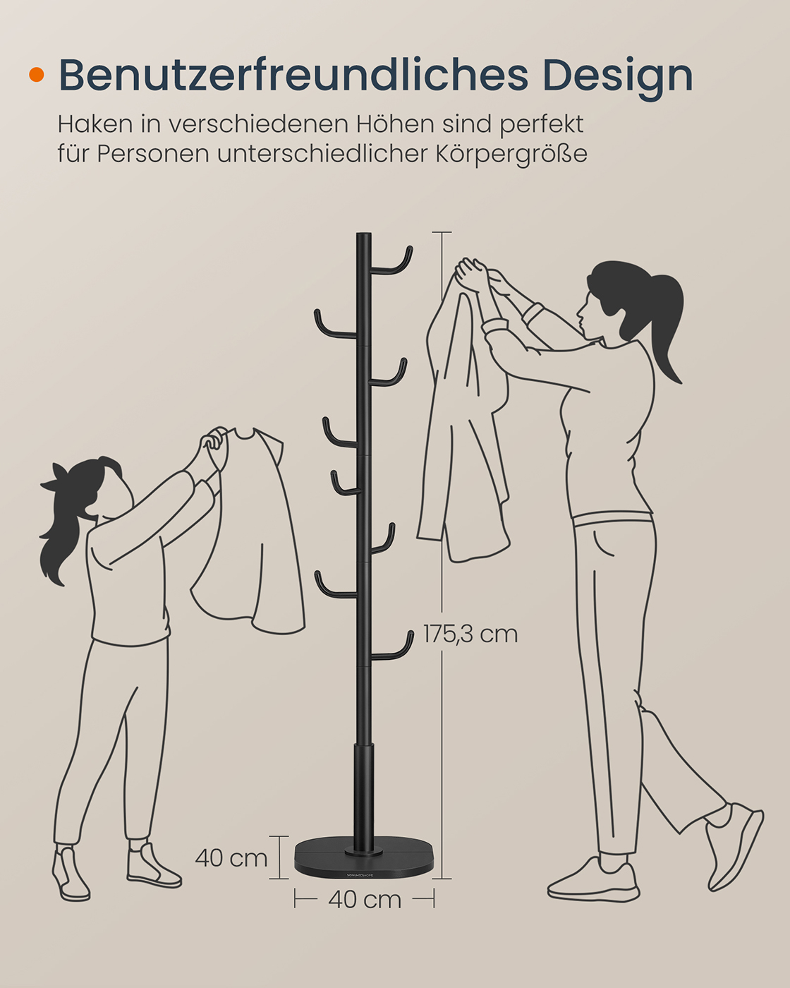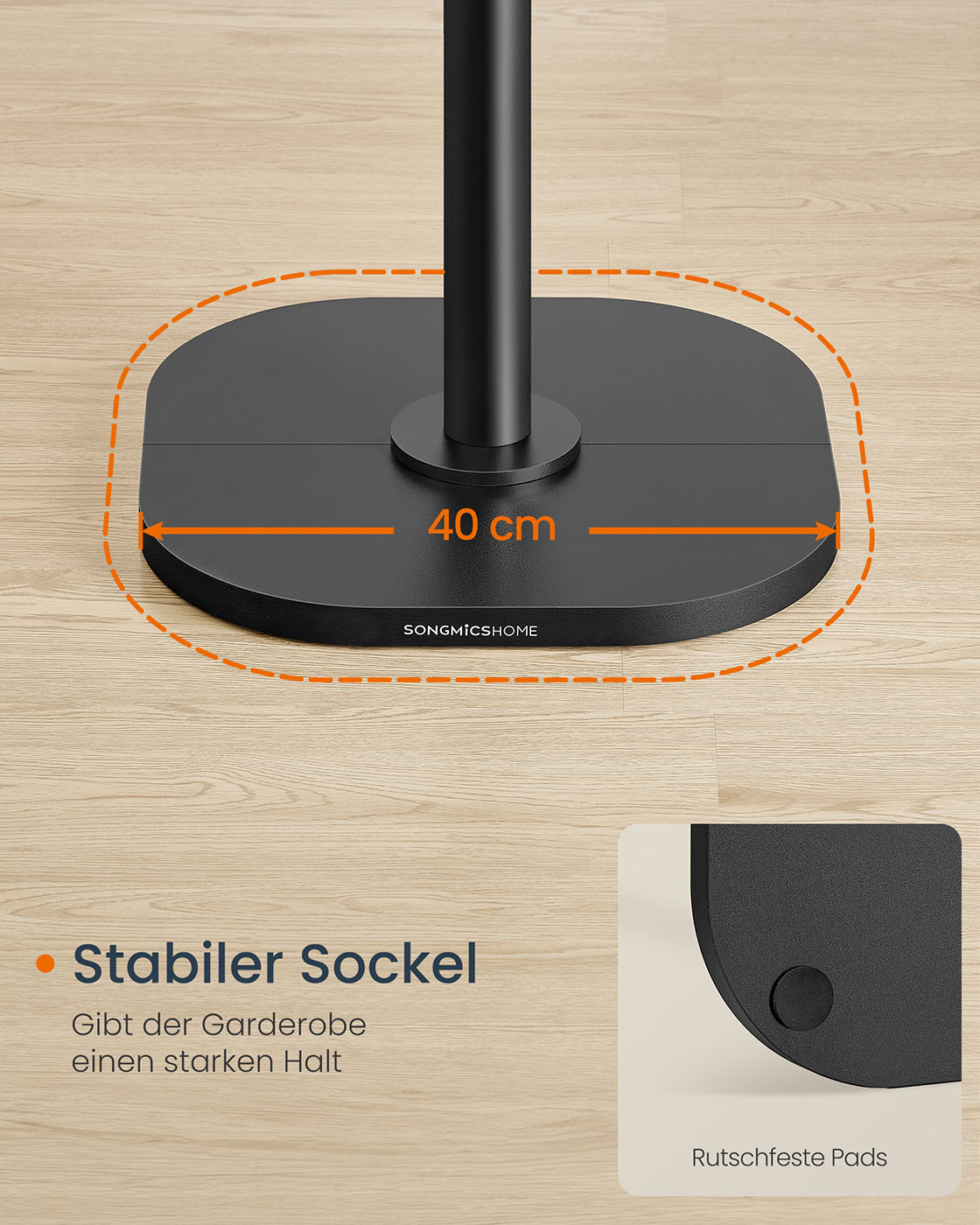 Ši elegantiška drabužių kabykla, kurios matmenys yra 40 x 40 x 175,3 cm, puikiai tinka jūsų drabužių ir aksesuarų laikymui. Juodos spalvos dizainas suteikia modernumo ir stiliaus jūsų interjerui.