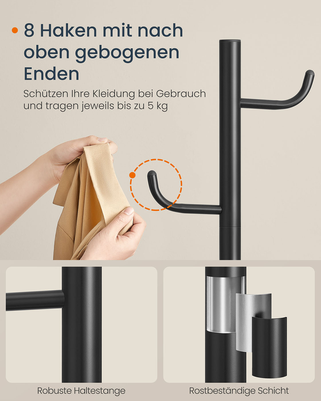 Maksimali statinė apkrova vienam kabliui yra 5 kg, o bendra maksimali statinė apkrova siekia 40 kg, užtikrinant, kad jūsų drabužiai ir aksesuarai bus saugiai laikomi.