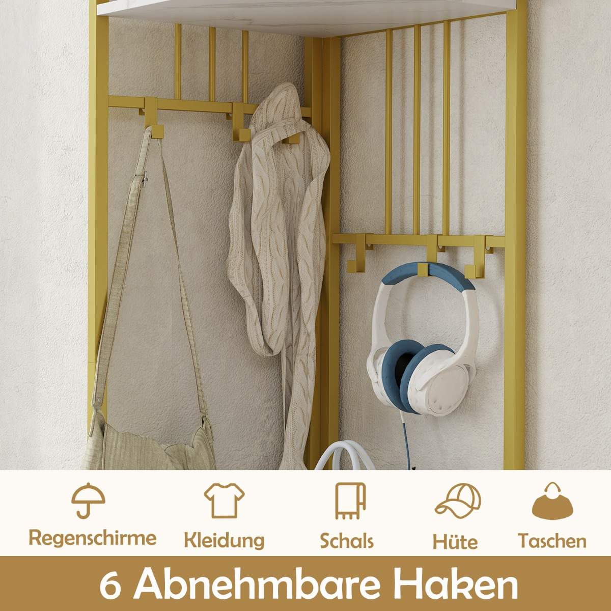 • 6 nuimami kabliukai suteikia pakankamai vietos paltams, kepurėms, skėčiams ir kitiems aksesuarams.