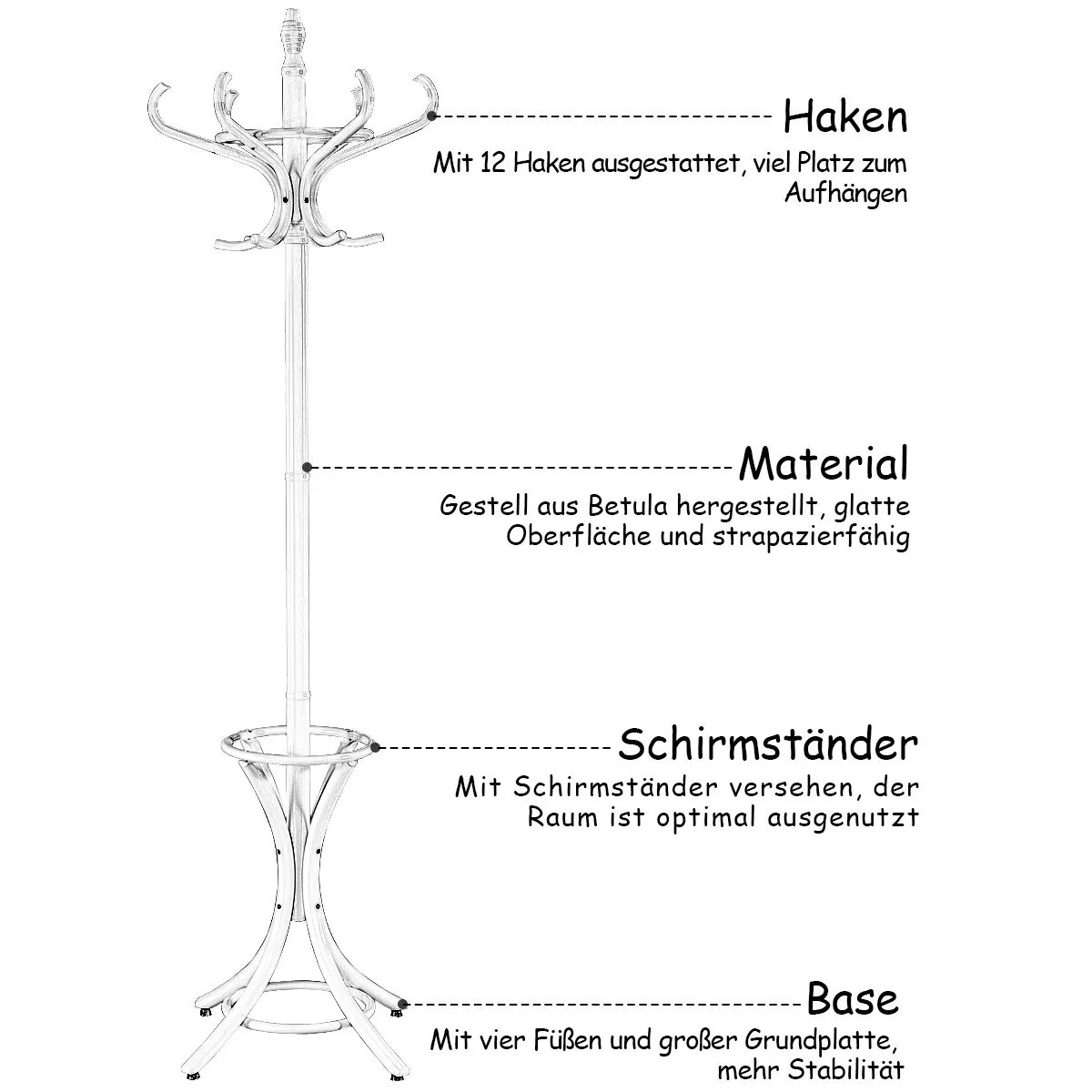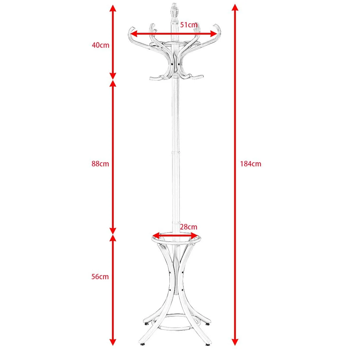 Drabužių kabykla 51x51x184cm., baltos spalvos – praktiškas sprendimas jūsų namų tvarkai palaikyti. Ši kabykla leidžia patogiai ir organizuotai laikyti paltus, skrybėles, rankines bei skėčius vienoje vietoje. Jos matmenys ir dizainas leidžia efektyviai išnaudoti erdvę prieškambaryje, koridoriuje ar miegamajame.