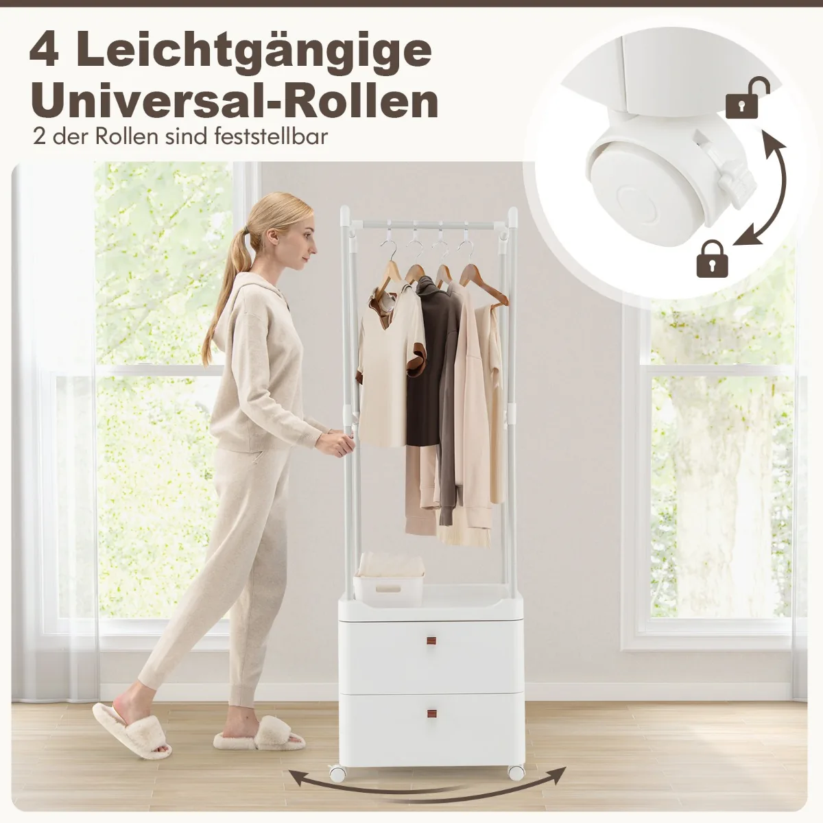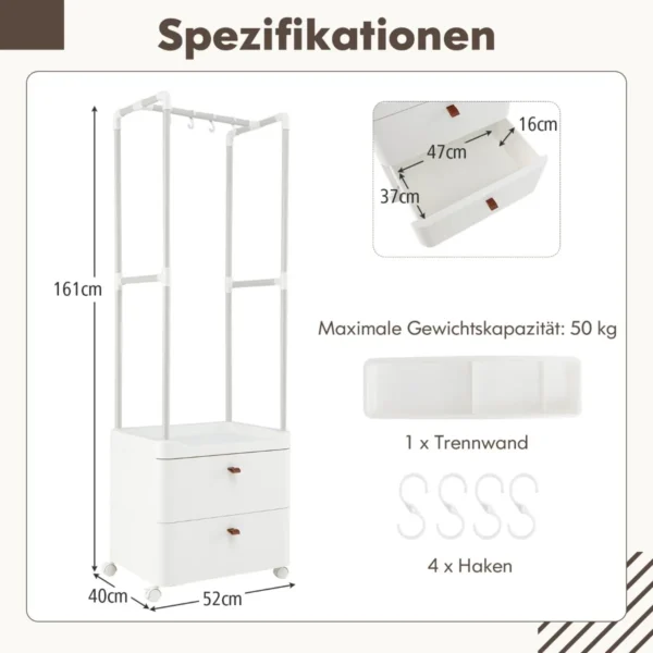 Drabužių kabykla 52x40x161cm, baltos spalvos, puikiai tinka tvarkingam rūbų ir aksesuarų laikymui. Ši daugiafunkcė drabužių kabyklos konstrukcija užtikrina patogų drabužių pakabinimą ir papildomą vietą smulkiems daiktams.