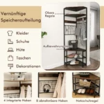 - Viršutinės lentynos, 4 fiksuoti ir 8 S formos kabliukai leidžia patogiai pakabinti paltus, šalikus, kepures ir krepšius.