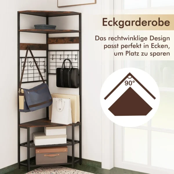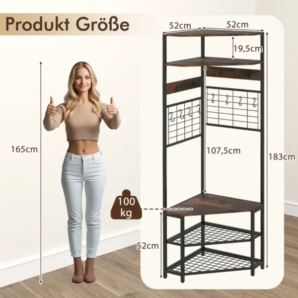 Drabužių kabykla 52x52x183cm juodos ir rudos spalvos – praktiškas ir vietą taupantis sprendimas jūsų prieškambariui ar kitiems kambariams. Šis kampinis modelis padeda tvarkingai laikyti rūbus, batus ir aksesuarus, optimizuojant erdvę bei užtikrinant patogumą kasdieniam naudojimui.