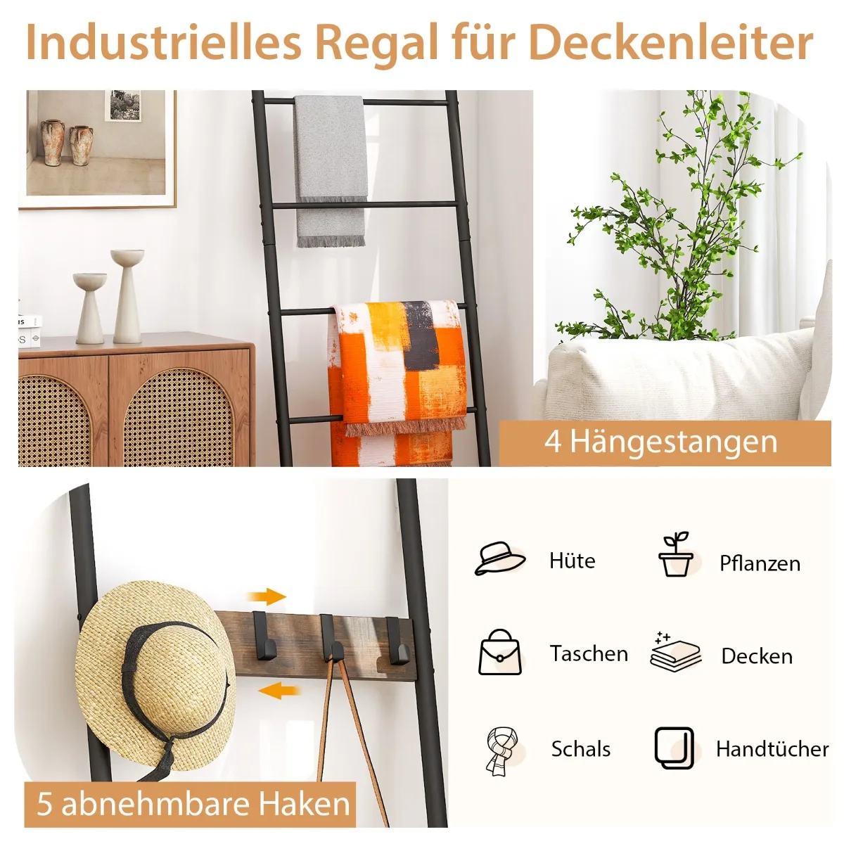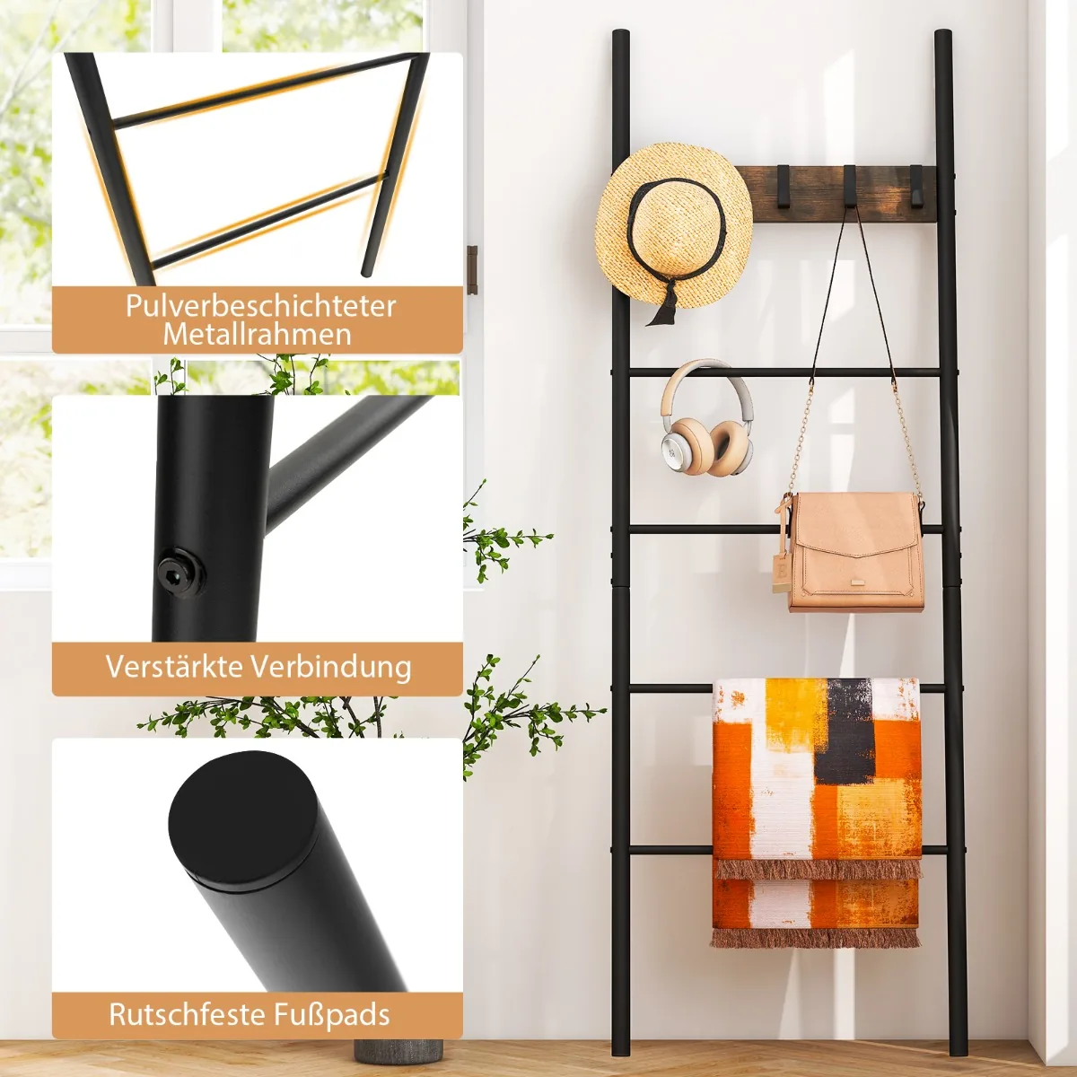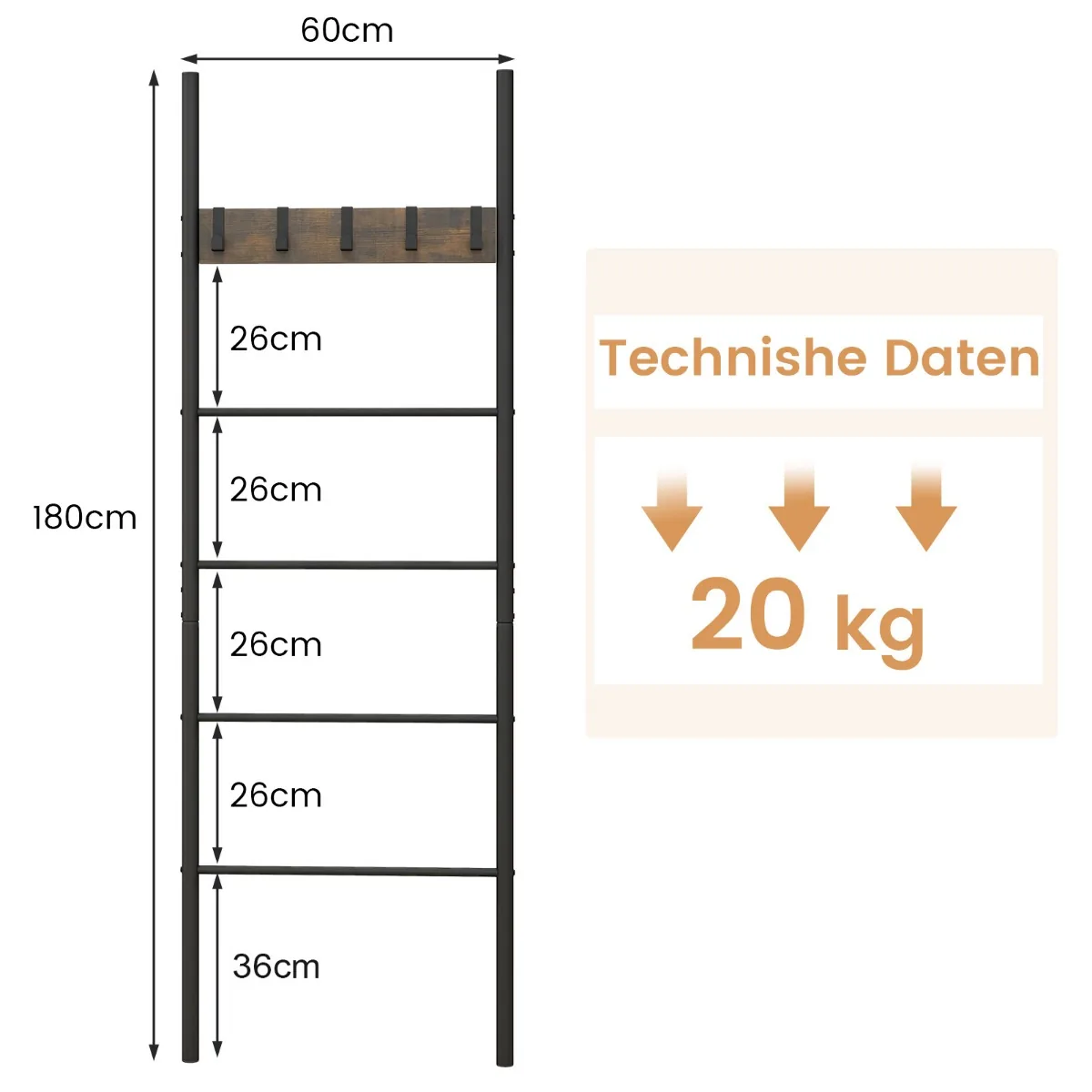 Drabužių kabykla 60×3,2×180 cm juodos ir rudos spalvų derinyje yra praktiškas sprendimas drabužių ir kitų daiktų organizavimui. Ši lentyna su 5 pakopomis ir kabliukais puikiai tinka mažoms gyvenamosioms erdvėms, vonios kambariams ar miegamiesiems, padedant sutvarkyti drabužius, rankšluosčius ar aksesuarus.