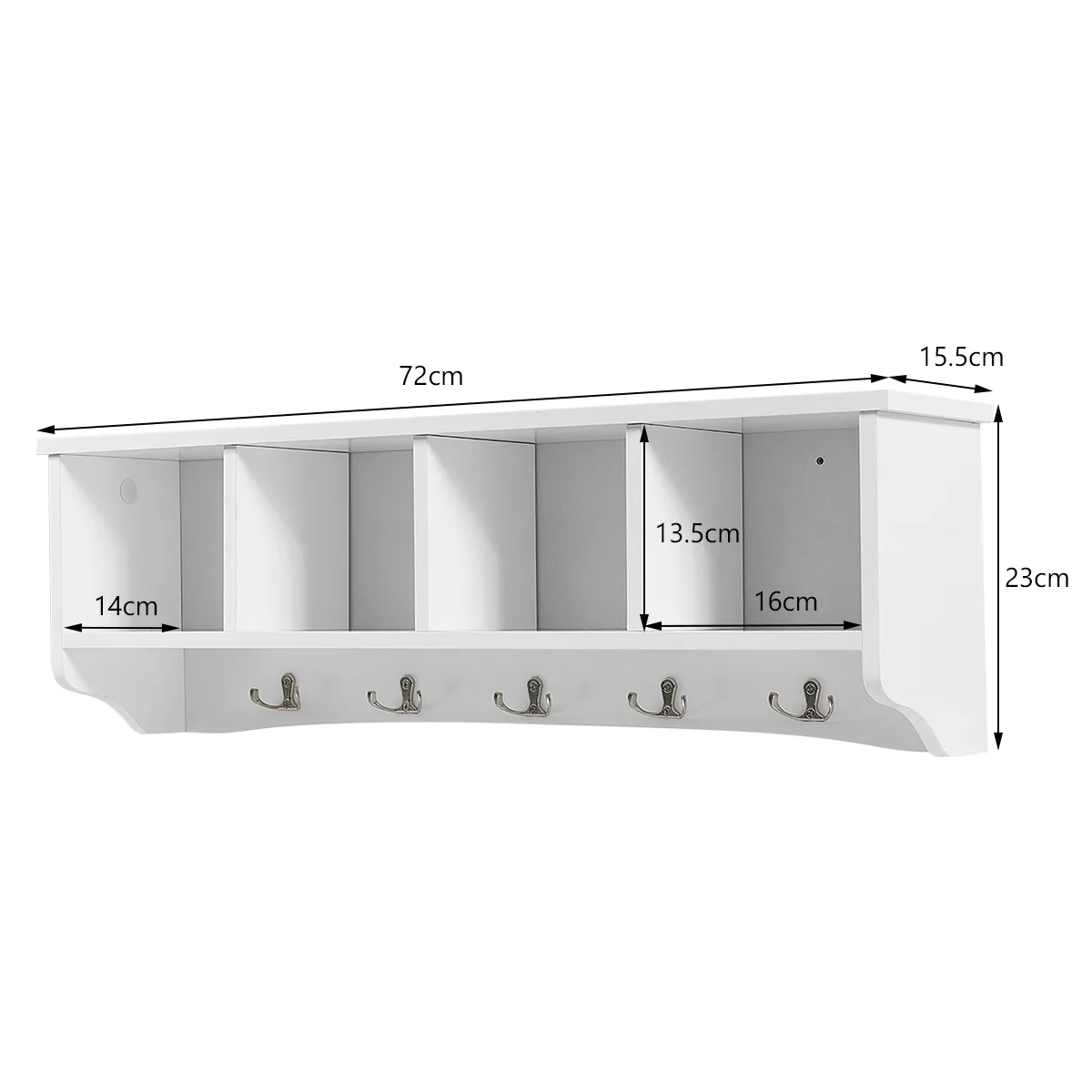 Drabužių kabykla 72×15,5x23cm baltos spalvos yra funkcionalus ir vietos taupantis sprendimas sienai. Ši kabykla suteikia patogią vietą įvairiems drabužiams, raktams ar skėčiams ir gali būti lengvai pritvirtinta bet kurioje patalpoje.