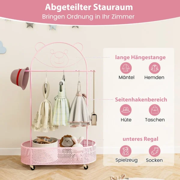 Drabužių kabykla 81x34x182cm, rožinės spalvos – patogus sprendimas vaikų kambariui, padedantis palaikyti tvarką ir tinkamai laikyti drabužius. Reguliuojamas aukštis leidžia pritaikyti kabyklą augančiam vaikui, o stabilus metalinis rėmas užtikrina ilgaamžiškumą.