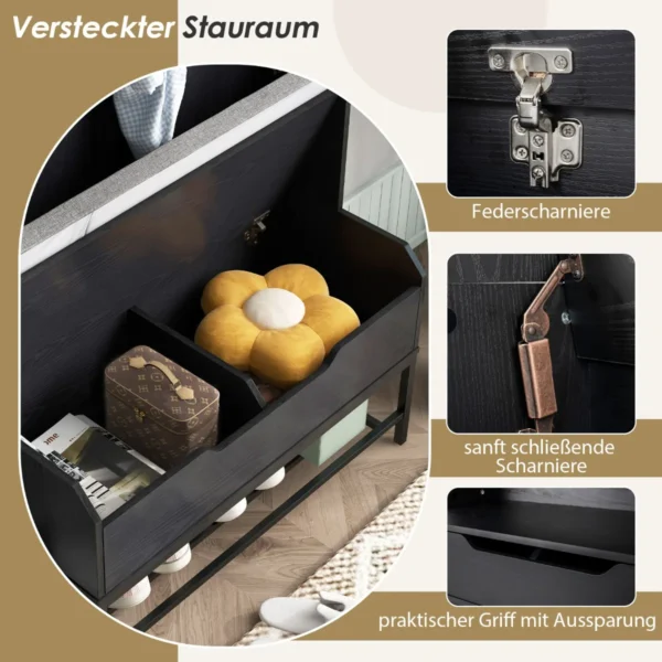 Drabužių kabykla 90×38,5x170cm juodos spalvos yra patogus sprendimas jūsų prieškambariui ar kitoms namų erdvėms. Ši paltų kabykla su integruotu batų suoliuku ir papildoma saugykla padeda tvarkingai laikyti drabužius, batus bei kitus svarbius daiktus.
