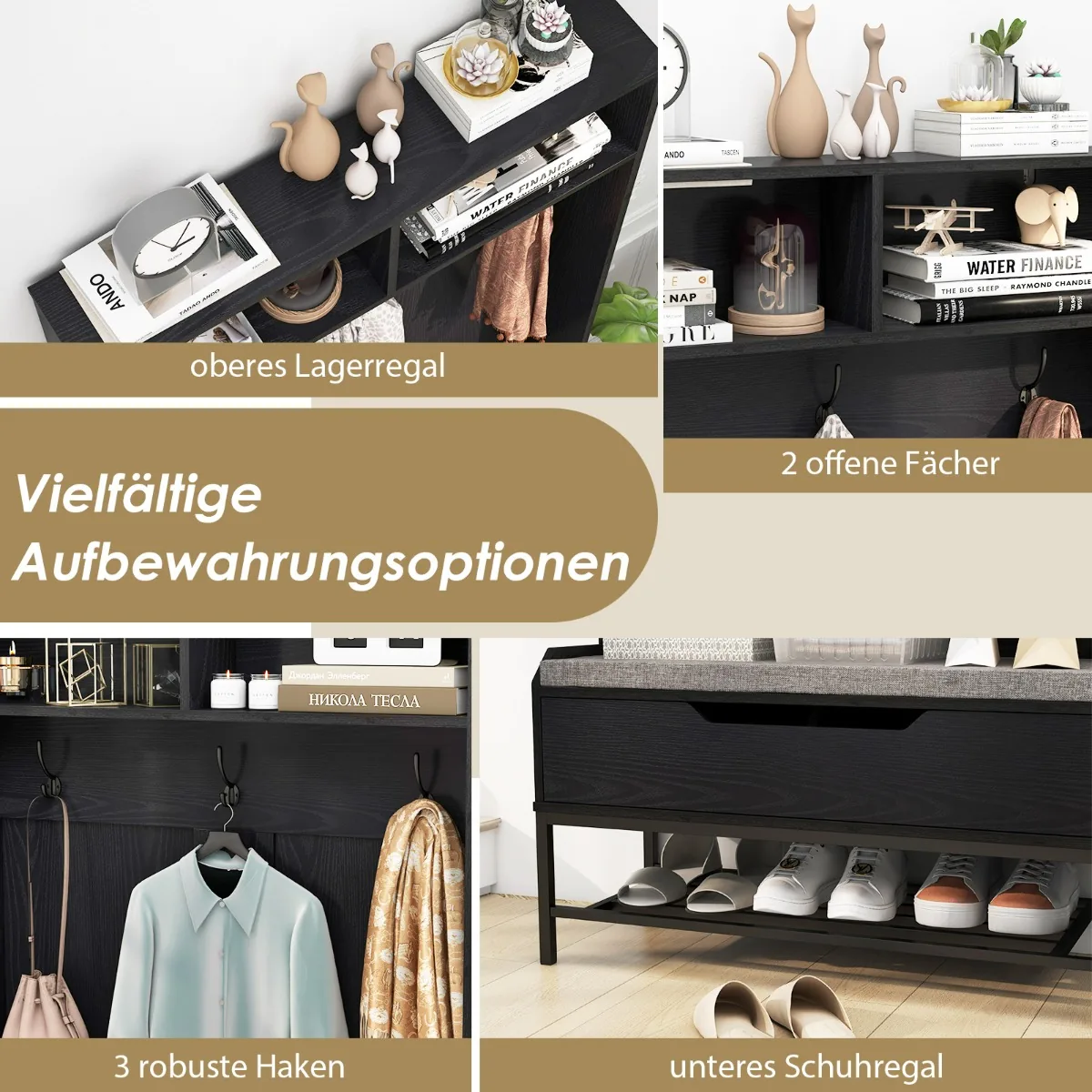 - Trys tvirti kabliukai ir apatinė lentyna užtikrina specifinę saugyklą drabužiams ir avalynei.