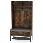 Drabužių kabykla 90×38,5x170cm rudos spalvos – funkcionali įėjimo kambario detalė, skirta tvarkingai laikyti paltus, batus ir kitus kasdienius daiktus. Kabykla su integruotu batų suoliuku ir papildomomis saugojimo vietomis padeda išlaikyti prieškambarį organizuotą.