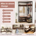 Drabužių kabykla 90x90x178 cm juodos ir rudos spalvos puikiai tinka tvarkingai laikyti drabužius, batus ir kitus daiktus. L formos dizainas leidžia efektyviai išnaudoti kampines vietas įėjimuose, svetaine ar miegamuosiuose. Tvirta konstrukcija ir įvairios laikymo galimybės užtikrina patogų kasdienį naudojimą.