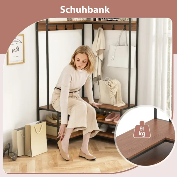 - Daugiafunkcinis dizainas – drabužių kabykla, batų saugykla ir keitimosi suoliukas viename.