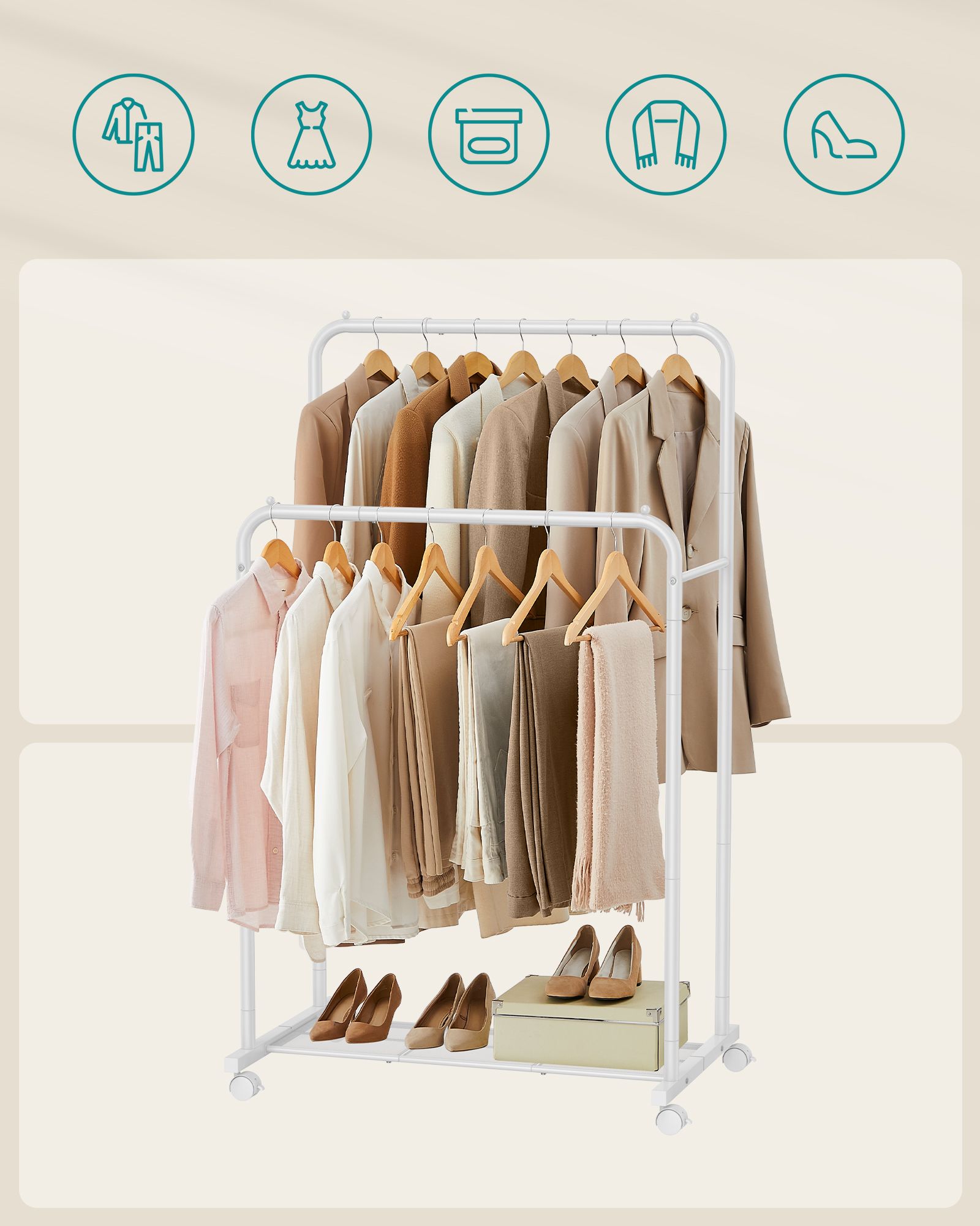 Ši elegantiška ir moderni drabužių kabykla yra puikus pasirinkimas tiems, kurie vertina stilių ir funkcionalumą. Jos minimalistinis dizainas ir balta spalva puikiai derės prie bet kokio interjero, suteikdama jūsų erdvei švaros ir tvarkos pojūtį.