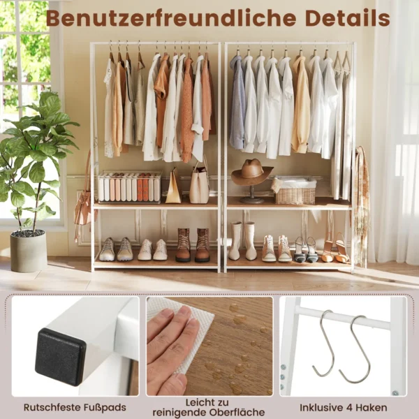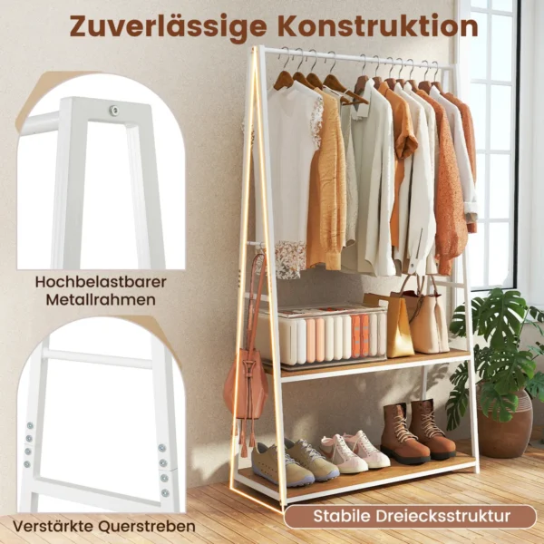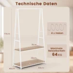 Drabužių kabykla 94x40x171cm baltos ir rudos spalvos – praktiškas sprendimas namų organizavimui. Ši metalinė kabykla su medžio elementais suteikia pakankamai vietos drabužiams, batams ir aksesuarams, padeda palaikyti tvarką įvairiose namų erdvėse.