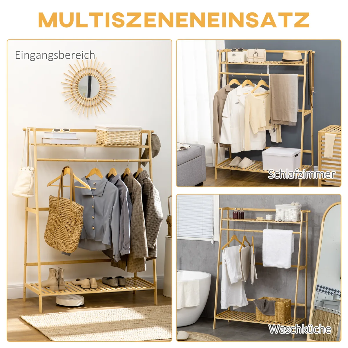 Mėgaukitės daugiau tvarkos ir sistemos savo namuose su palto stovu iš HOMCOM. Jame yra du paltų kabliukai ir drabužių kabykla paltams, šalikams ir krepšiams, taip pat dvi atviros lentynos krepšeliams ir kasdieniams daiktams, kad viskas būtų tvarkinga. Natūralaus bambuko rėmas suteikia stilingo funkcionalumo bet kuriam įėjimui, svetainei ar miegamajam.